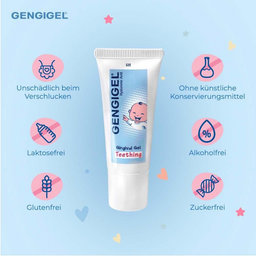 Гель GENGIGEL Erste Zähnchen для облегчения боли при прорезывании первых зубов у младенцев. Содержит гиалуроновую кислоту для улучшения эластичности десен и ускорения регенерации тканей. Не содержит алкоголя, сахара, искусственных ароматизаторов и консервантов.