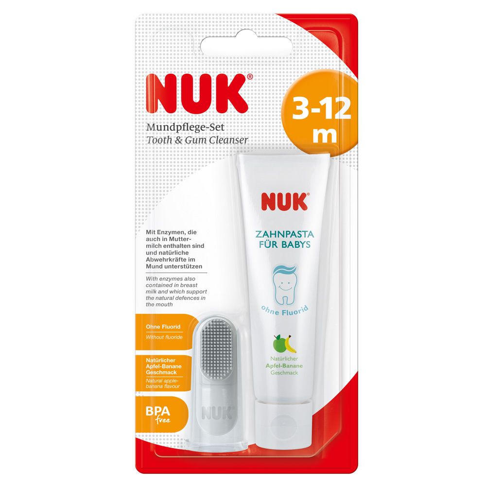 Набор для ухода за полостью рта NUK для первых зубов ребенка: зубная паста без сахара с натуральным вкусом яблока-банана и пальцевая зубная щетка с мягкими щетинками. Без BPA, без фторида, с ферментами для укрепления защитных сил в полости рта.
