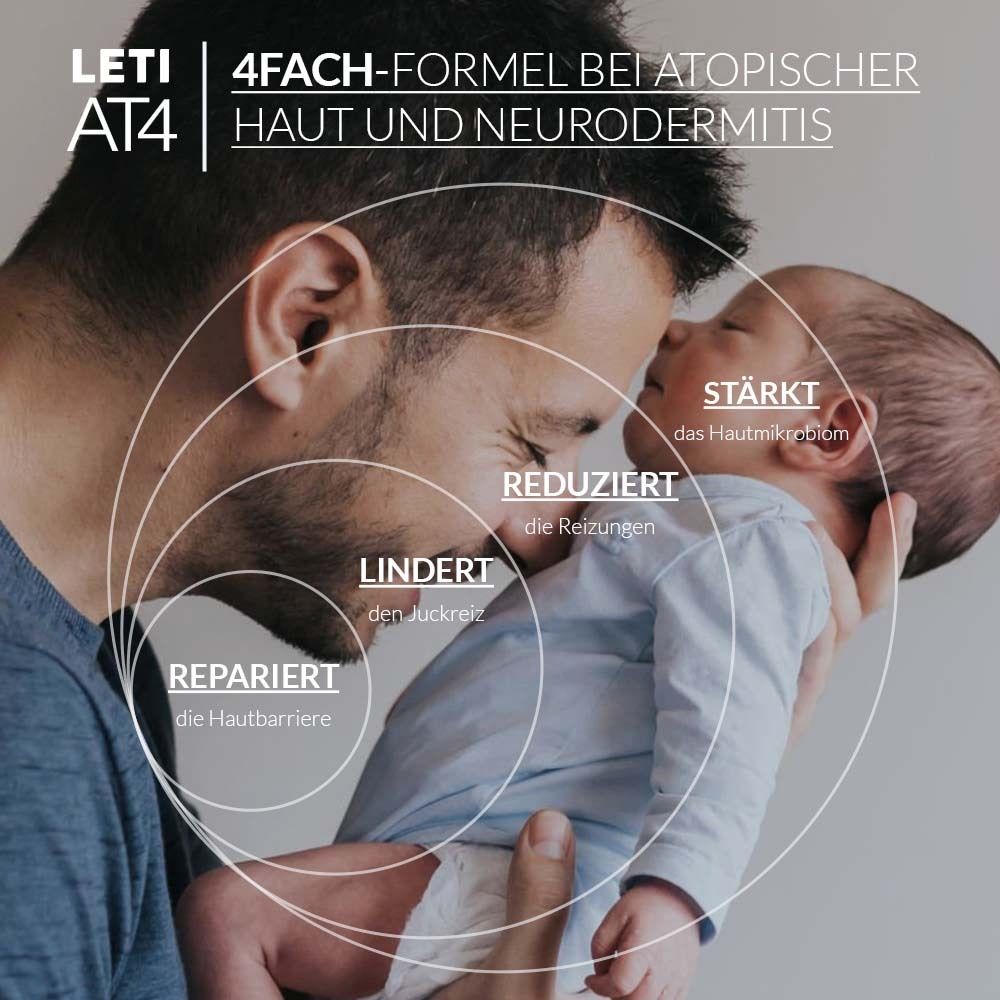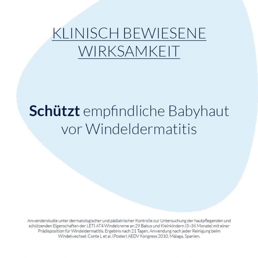 LETI AT4 Windelcreme - специальная крем-паста для ухода за кожей в области подгузников у младенцев и детей. Образует защитный барьер, впитывает излишнюю влагу, снимает воспаление и восстанавливает кожный барьер. Подходит для детей с 3 месяцев, особенно при сухой коже и склонности к нейродермиту. Не содержит парабенов, протестирована дерматологически и педиатрически.