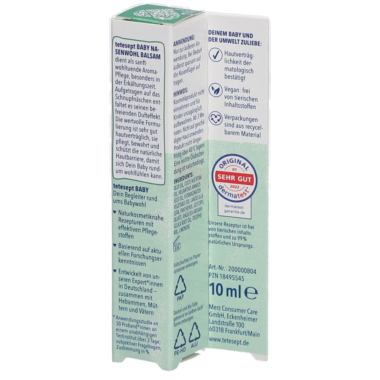 tetesept® Baby Nasenwohl Balsam - нежный арома-бальзам для ухода за носом младенцев от 3 месяцев. Создает мягкий освобождающий ароматический эффект, ухаживает за чувствительной кожей, защищает естественный кожный барьер. Особенно полезен в период простудных заболеваний.