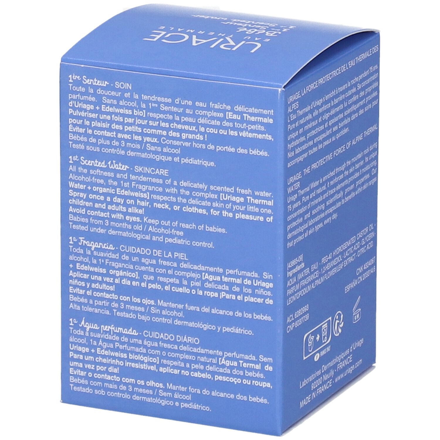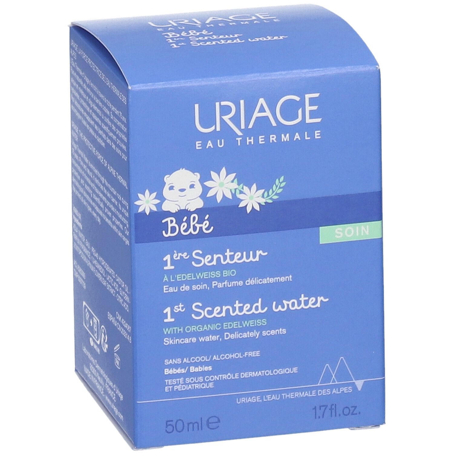Душистая вода для ухода за кожей младенцев URIAGE Baby 1st Scented Water - нежное средство без алкоголя на основе термальной воды Uriage и экстракта эдельвейса. Подходит для ежедневного ухода за волосами и кожей головы ребенка.