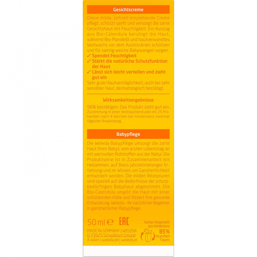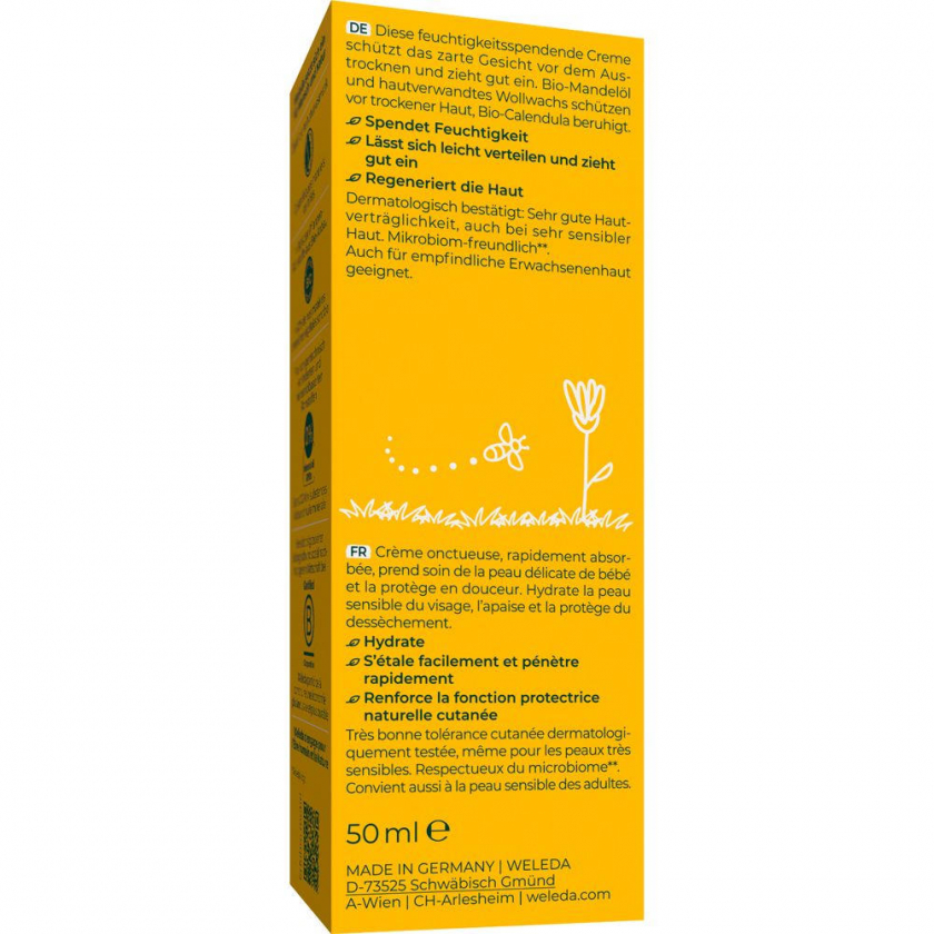 Weleda Baby Gesichtscreme Calendula - натуральная увлажняющая крем для лица для ухода за чувствительной кожей младенцев. Содержит масло сладкого миндаля, пчелиный воск и экстракт календулы для защиты, увлажнения и успокоения кожи. Подходит также для взрослых с чувствительной кожей.