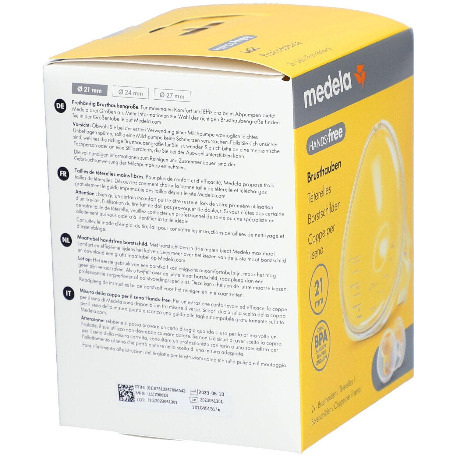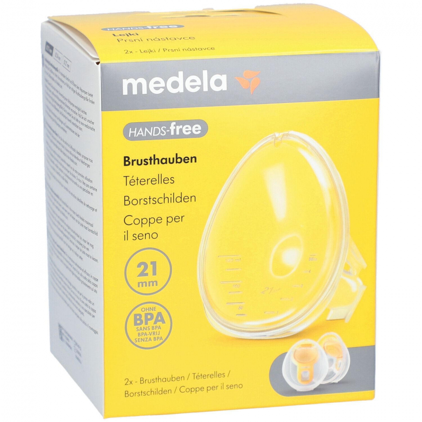 Freestyle™ Hands-free Brusthauben - специальные насадки для груди от Medela, предназначенные для использования с молокоотсосом Freestyle™ Hands-free. Имеют угол раскрытия 105° для снижения давления на грудь и оптимизации потока молока. Изготовлены из безопасного пищевого пластика без BPA. В комплекте 2 насадки размером 21 мм.