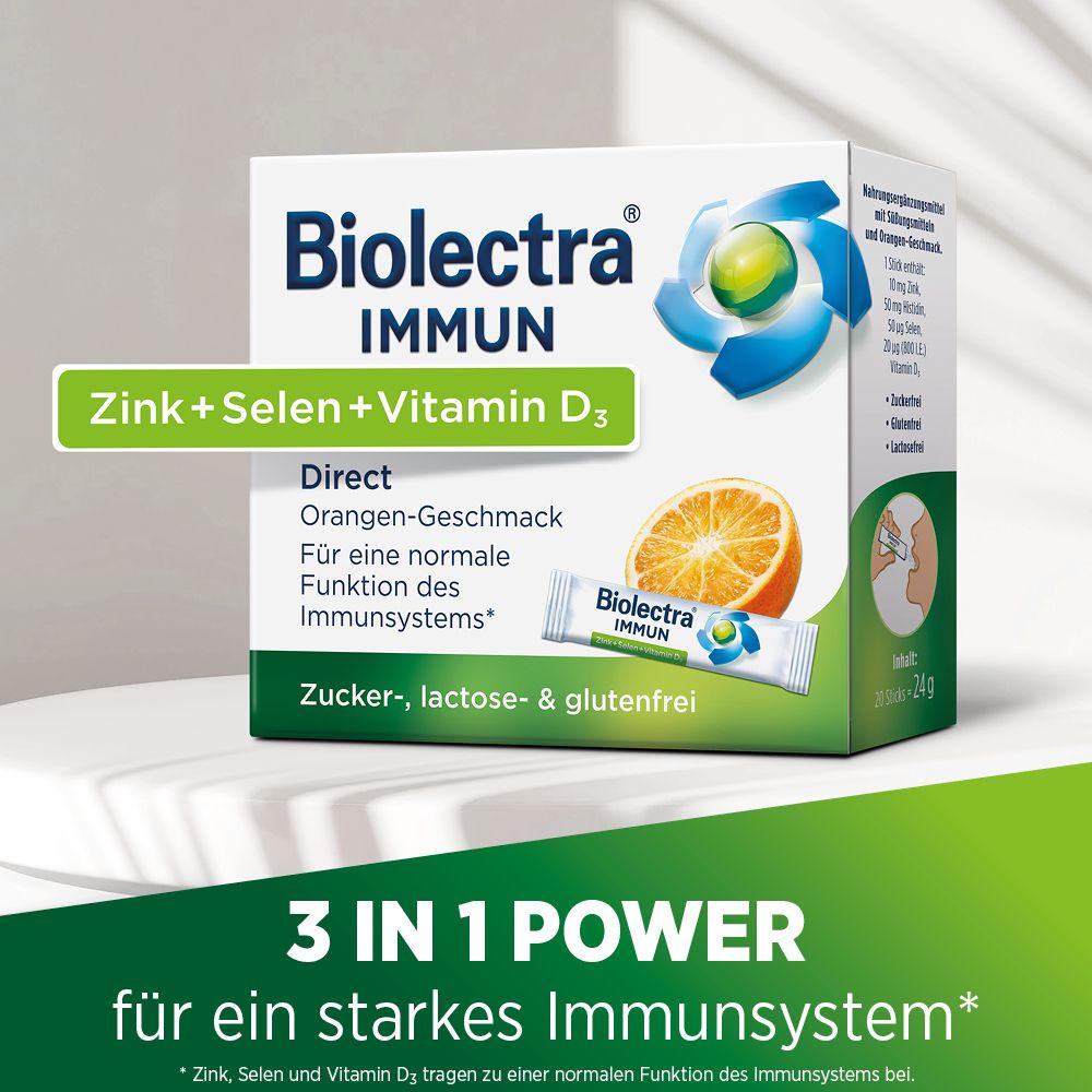 Biolectra Immun Direct Orange - пищевая добавка для поддержки иммунной системы с цинком, селеном и витамином D3. Содержит 10 мг цинка, 50 мкг селена и 20 мкг витамина D3 в одном стике. Удобная форма микро-пеллет, которые растворяются во рту. Подходит для взрослых мужчин и женщин, не содержит глютен и лактозу.