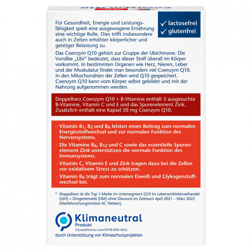 Doppelherz® aktiv Coenzym Q10 + B-Vitamine - пищевая добавка с коэнзимом Q10, витаминами группы B, C, E и цинком для поддержки энергетического обмена, нервной системы и защиты клеток от окислительного стресса. Подходит для взрослых в периоды повышенных физических нагрузок.