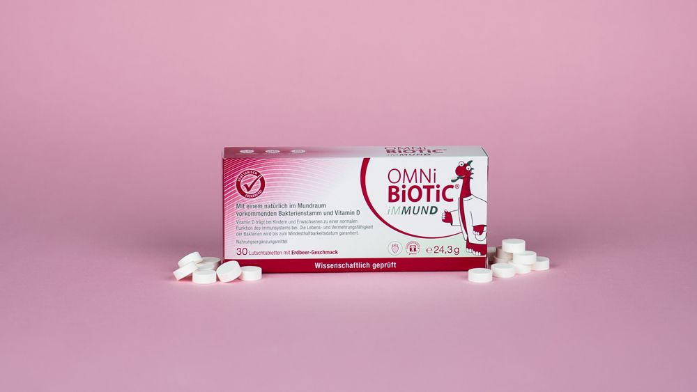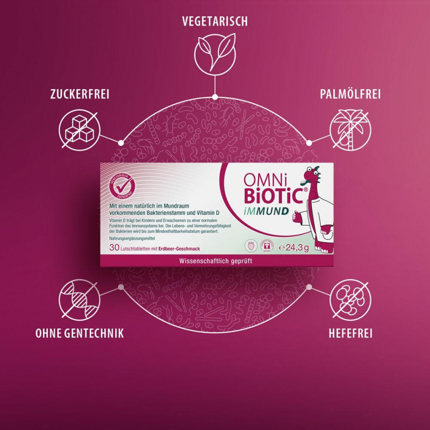 OMNi-BiOTiC® iMMUND - это пищевая добавка в форме жевательных таблеток с клубничным вкусом, содержащая пробиотический штамм Streptococcus salivarius K12 и витамин D для поддержания нормальной функции иммунной системы и здоровья полости рта у детей и взрослых