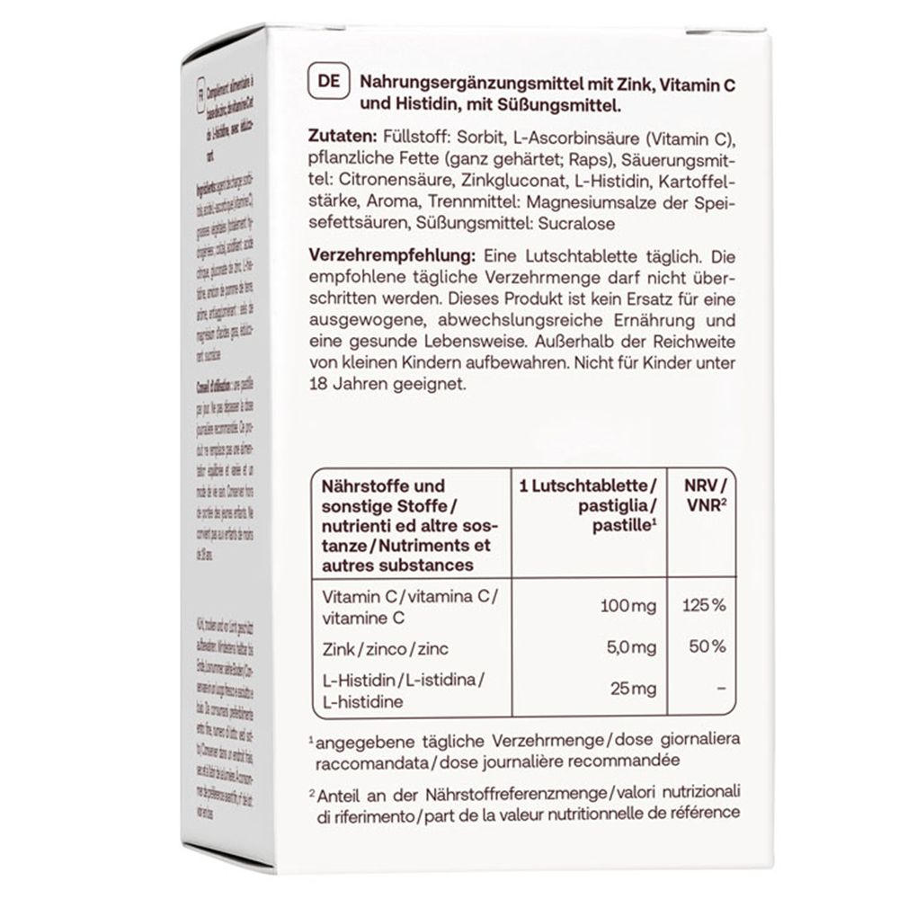 Состав: Наполнитель: сорбит, L-аскорбиновая кислота (витамин C), растительные жиры (полностью гидрогенизированные; рапс), подкислитель: лимонная кислота, глюконат цинка, L-гистидин, картофельный крахмал, ароматизатор, разделитель: соли магния жирных кислот, подсластитель: сукралоза