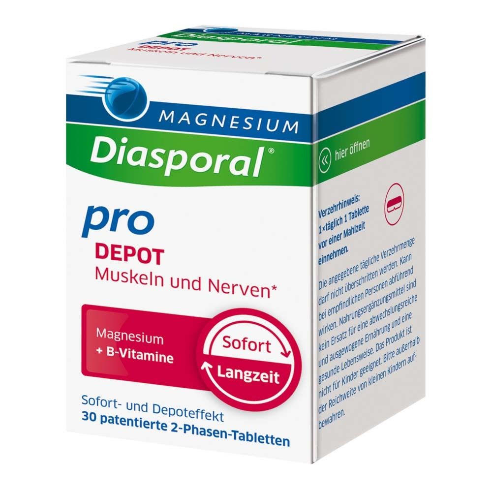 Пищевая добавка Magnesium-Diasporal Pro DEPOT с магнием и витаминами группы B для поддержки мышц и нервной системы. Содержит 300 мг магния и комплекс витаминов B1, B2, B6, B12. DEPOT-эффект с двухфазным высвобождением. Без сахара, веганский, без глютена и лактозы. Принимать по 1 таблетке в день перед едой.