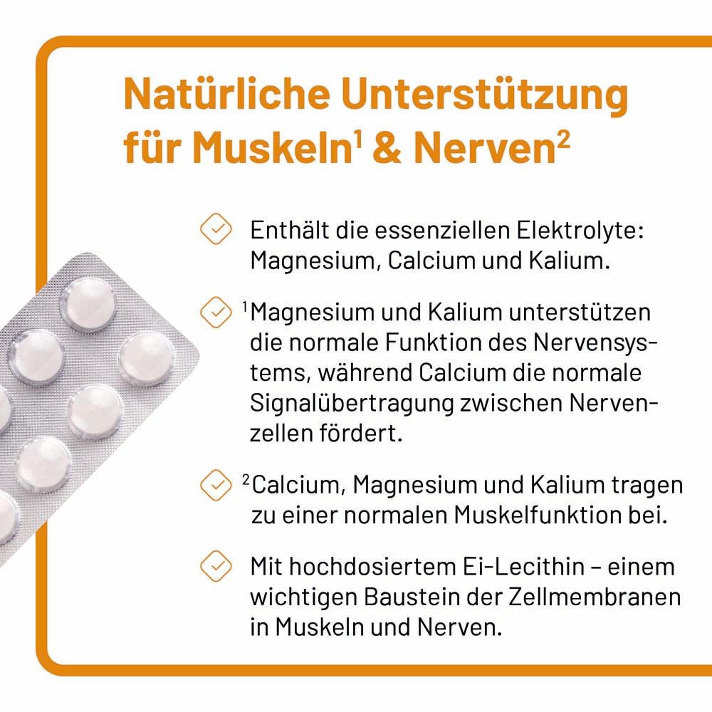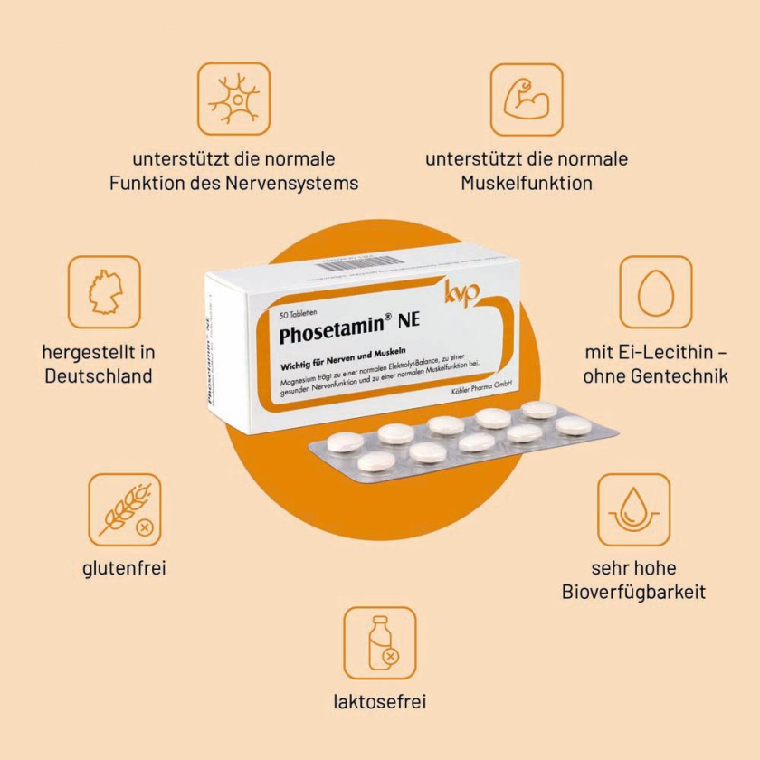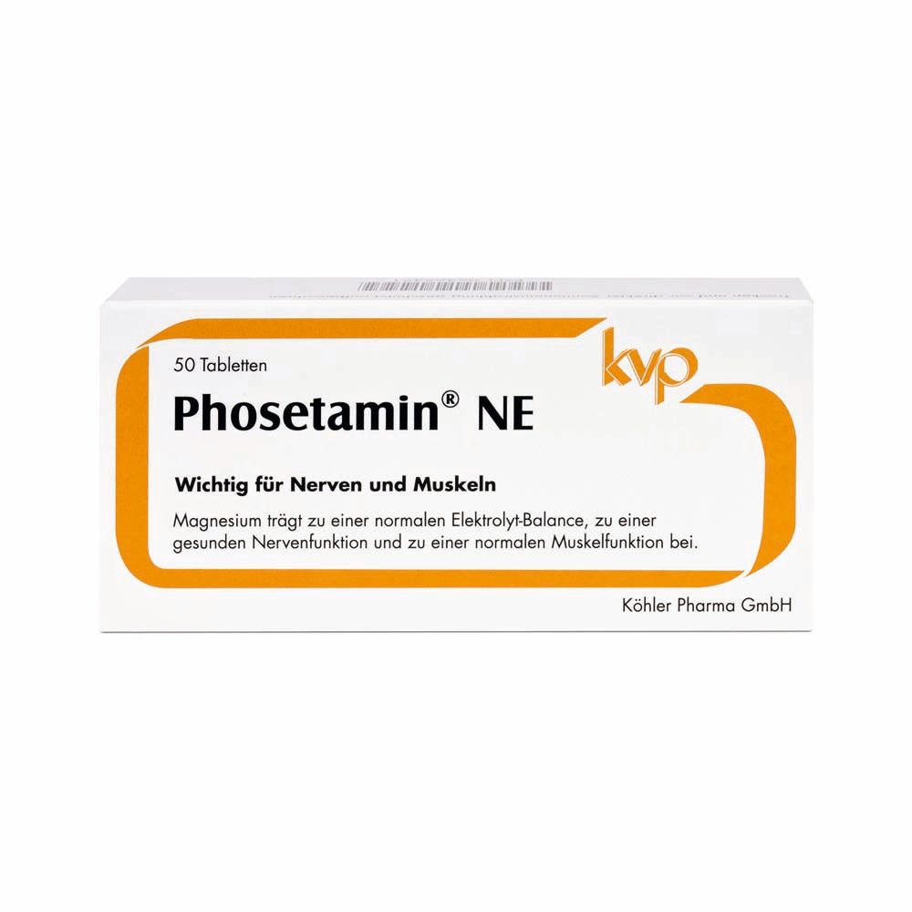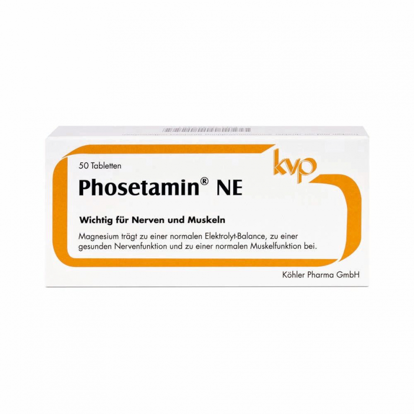 Phosetamin® NE Tabletten - пищевая добавка с электролитами (магний, калий, кальций) и фосфатидилхолином из яичного лецитина. Поддерживает нормальную функцию нервов и мышц, способствует электролитному балансу, здоровой нервной функции и мышечной активности. Без глютена, желатина, фруктозы, лактозы, дрожжей, искусственных красителей и консервантов.