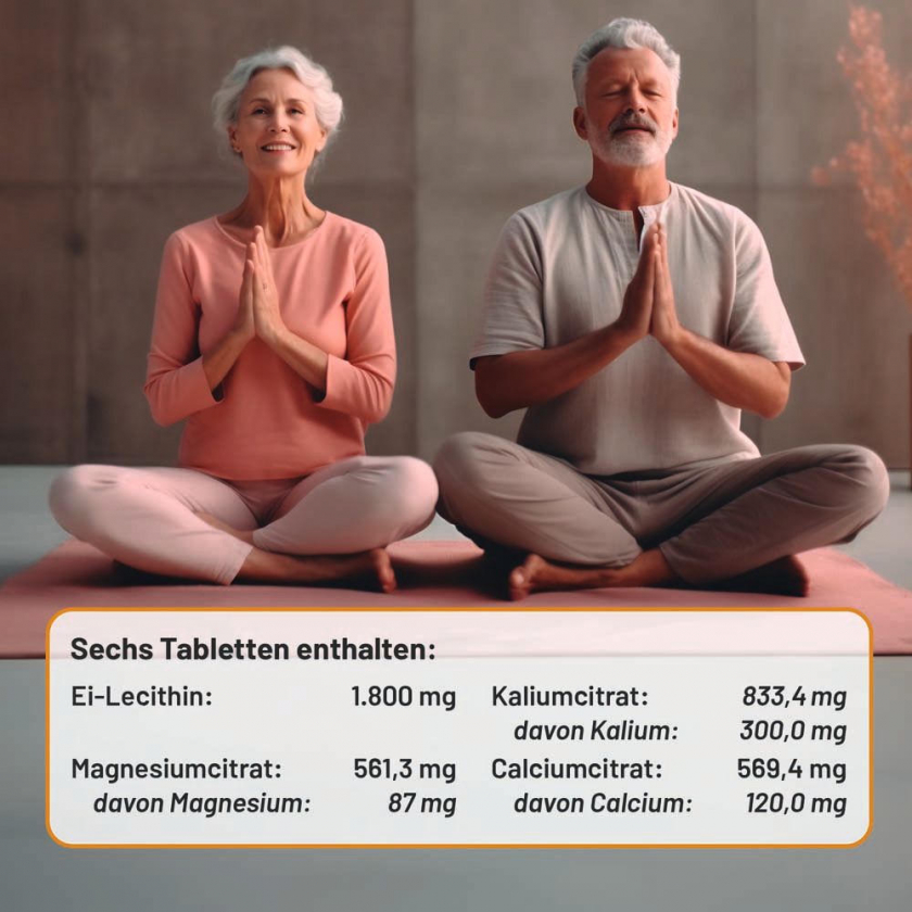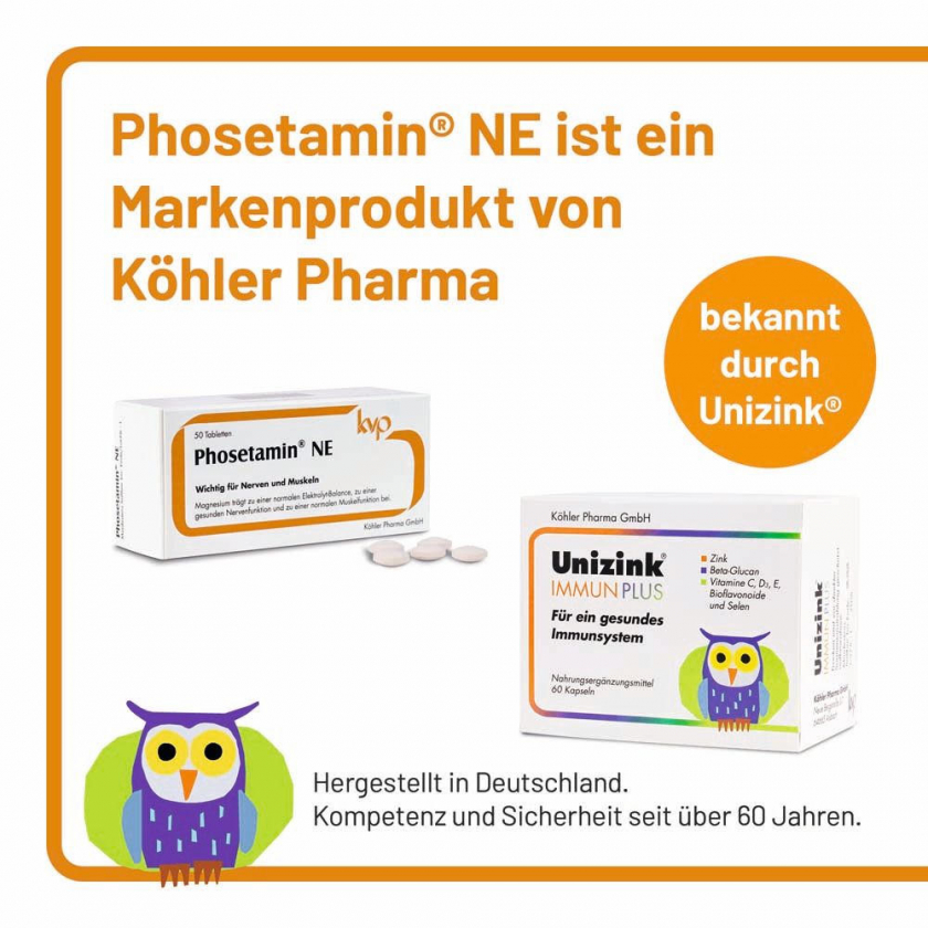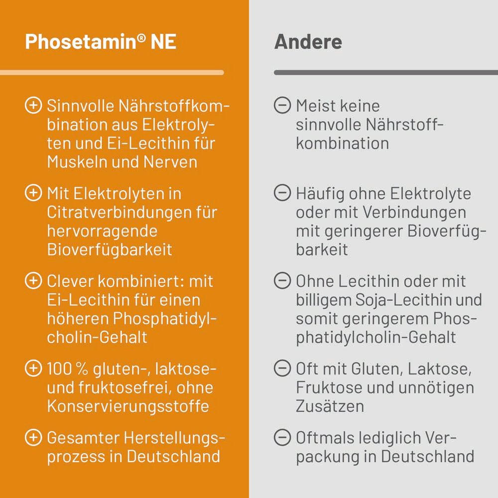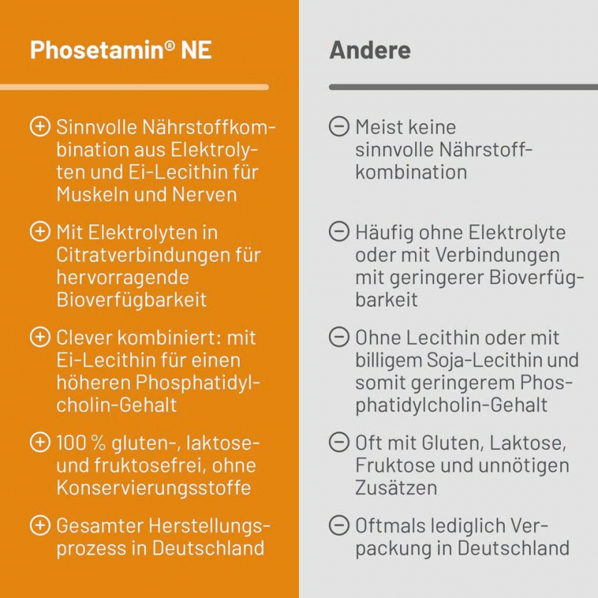 Phosetamin® NE Tabletten - пищевая добавка с электролитами (магний, калий, кальций) и фосфатидилхолином из яичного лецитина. Поддерживает нормальную функцию нервов и мышц, способствует электролитному балансу, здоровой нервной функции и мышечной активности. Без глютена, желатина, фруктозы, лактозы, дрожжей, искусственных красителей и консервантов.