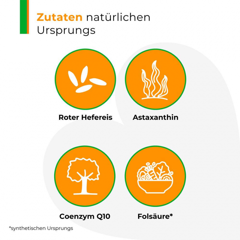 Состав: Стабилизаторы: дикальцийфосфат, микрокристаллическая целлюлоза, красный ферментированный рис (Monascus pupureus) с содержанием 1,5% монаколина, экстракт астаксантина из зеленых водорослей, кукурузный крахмал, аскорбилпальмитат, токоферолы, разделитель: соли магния жирных кислот, диоксид кремния, коэнзим Q10, птероилмоноглутаминовая кислота (фолиевая кислота)