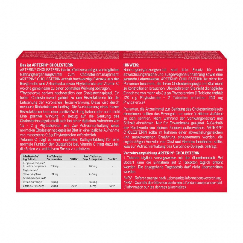 Arterin Cholesterin Tabletten - биологически активная добавка для поддержания нормального уровня холестерина. Содержит фитостеролы, экстракт бергамота, экстракт артишока и витамин C. Подходит для взрослых, принимается по 1-2 таблетки в день с едой. Производится в Германии компанией Perrigo Deutschland GmbH.
