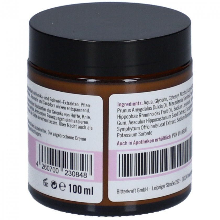 Крем для кожи с экстрактами горьких трав, арники и окопника по рецептуре Хильдегарды фон Бинген. Содержит растительные масла для ухода за кожей, розмарин и облепиху для расслабляющего эффекта. Предназначен для ухода за кожей в области суставов, снятия напряжения и усталости.