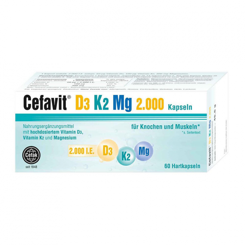 Пищевая добавка Cefavit® D3 K2 Mg с высокими дозами витамина D3, витамина K2 и магния. Поддерживает нормальную функцию мышц и здоровье костей. Подходит для вегетарианцев, без глютена и аллергенов. Рекомендуется взрослым, подросткам и детям с 7 лет.