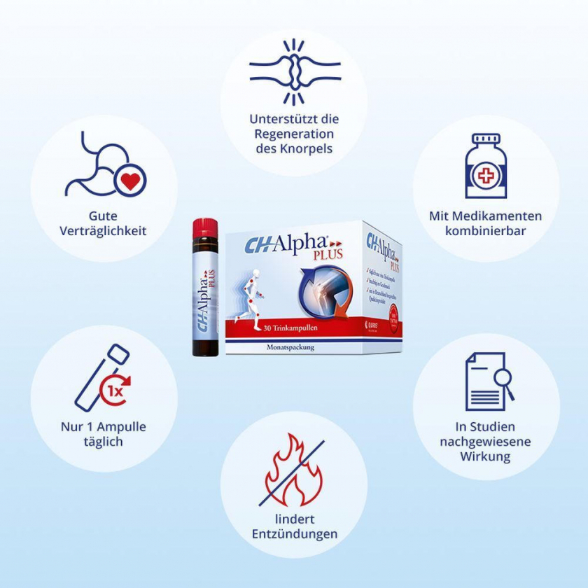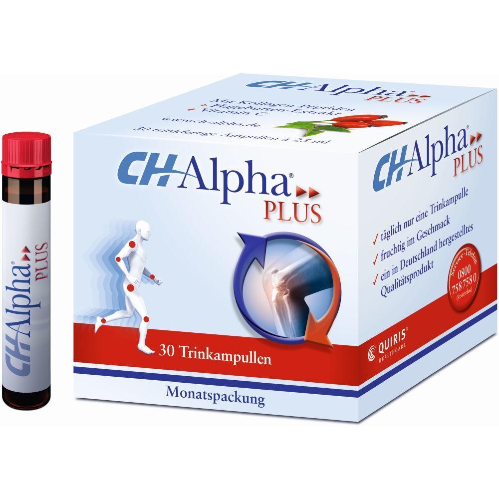 CH-Alpha PLUS - пищевая добавка для поддержания здоровья суставов и хрящей в виде питьевых ампул. Содержит коллагеновые пептиды, экстракт шиповника и витамин C для улучшения подвижности и уменьшения воспалений. Подходит для взрослых при возрастных изменениях или повышенных нагрузках на суставы.