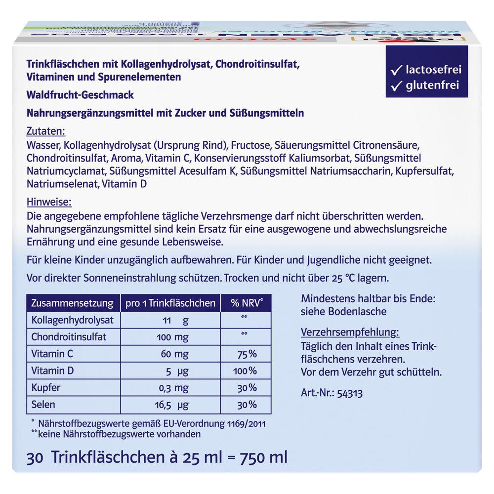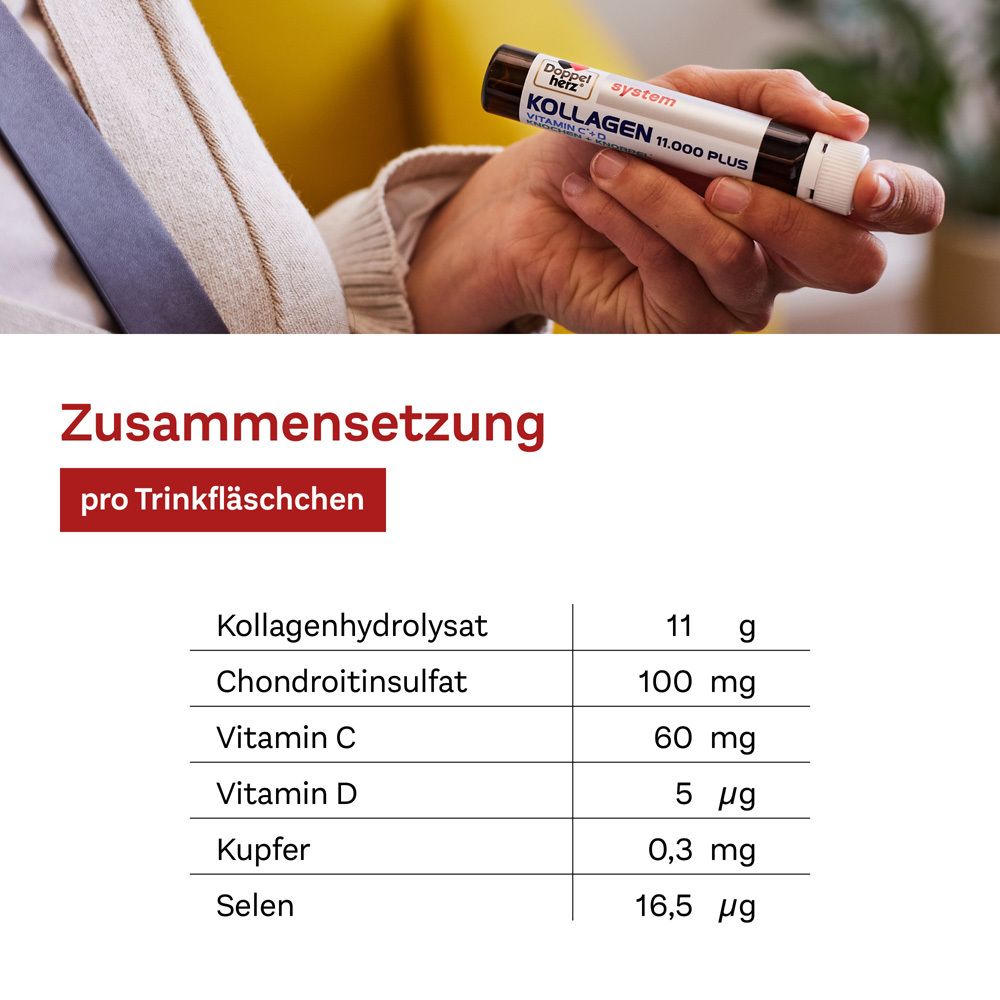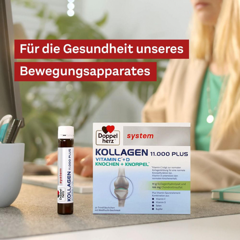 Doppelherz system KOLLAGEN 11.000 PLUS - пищевая добавка для поддержки здоровья суставов и костей. Содержит 11 г гидролизата коллагена, 100 мг хондроитинсульфата, витамины C, D, селен и медь. Упаковка: 30 питьевых флаконов по 25 мл с вкусом лесных ягод. Способствует нормальному образованию коллагена и функционированию хрящей и костей.