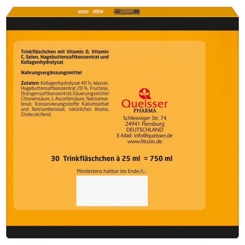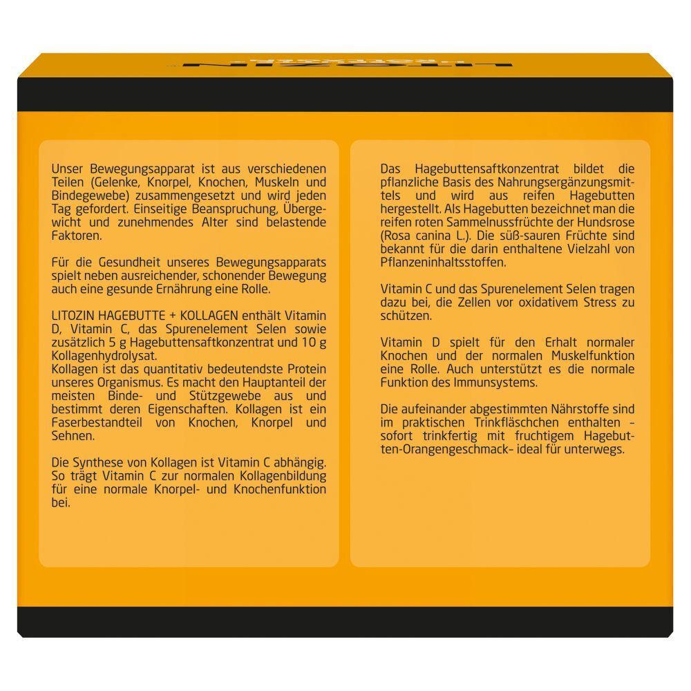 Пищевая добавка LITOZIN® Hagebutte + Kollagen в форме питьевых флаконов содержит коллагеновый гидролизат, концентрат сока шиповника, витамины C и D, селен. Способствует здоровью суставов, костей и соединительной ткани, защищает клетки от окислительного стресса, поддерживает иммунную систему. Готовый к употреблению напиток с фруктовым вкусом шиповника и апельсина.