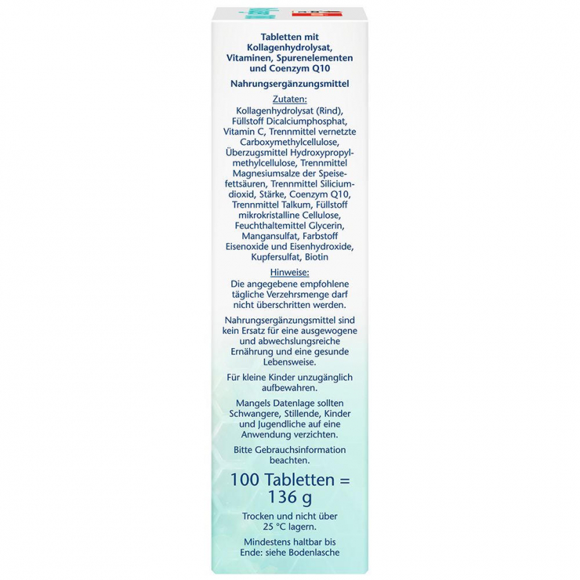 Коллагенгидролизат (говядина), наполнитель дикальцийфосфат, витамин C, разделитель сшитая карбоксиметилцеллюлоза, покрывающее средство гидроксипропилметилцеллюлоза, разделитель соли магния пищевых жирных кислот, разделитель диоксид кремния, крахмал, коэнзим Q10, разделитель тальк, наполнитель микрокристаллическая целлюлоза, увлажнитель глицерин, сульфат марганца, краситель оксиды и гидроксиды железа, сульфат меди, биотин