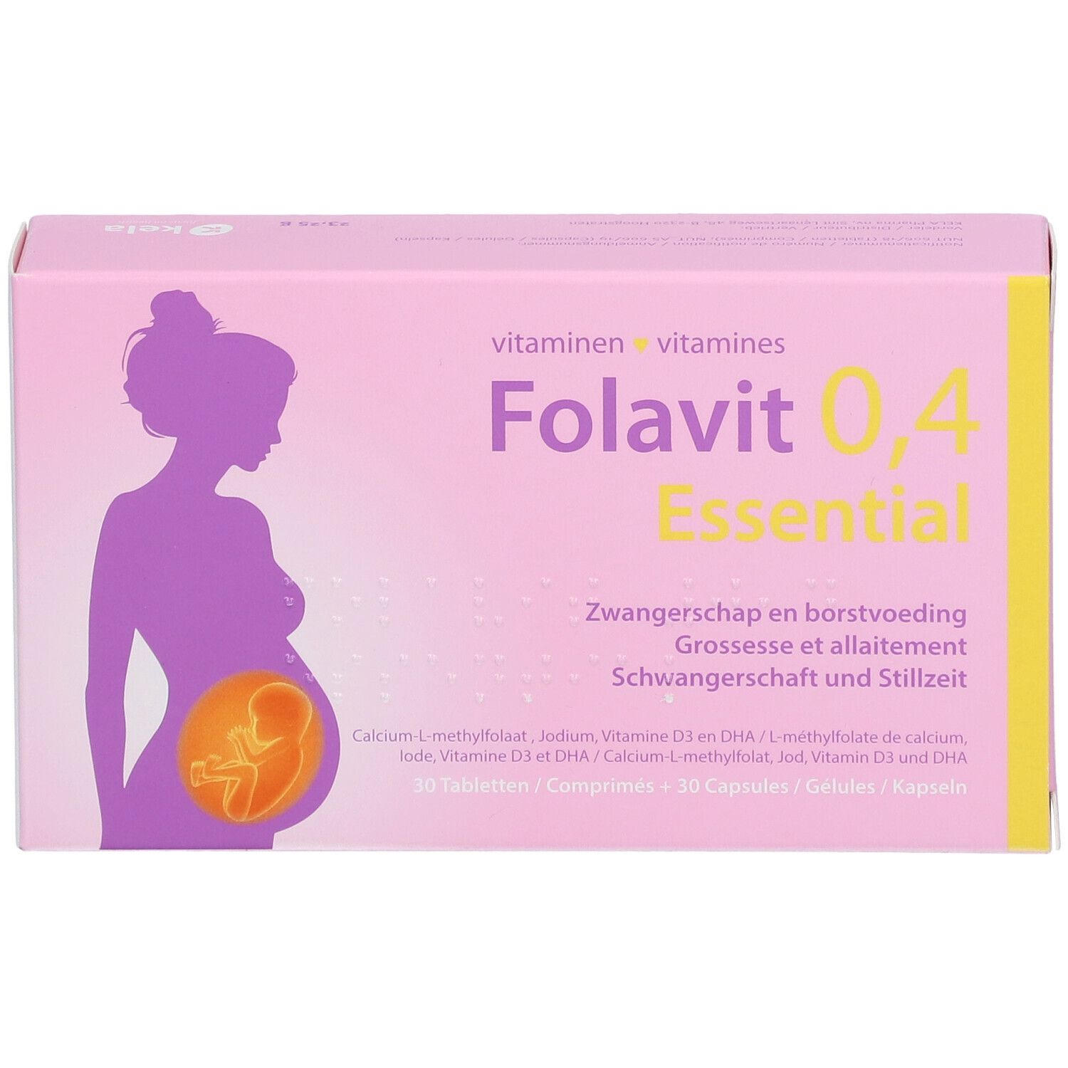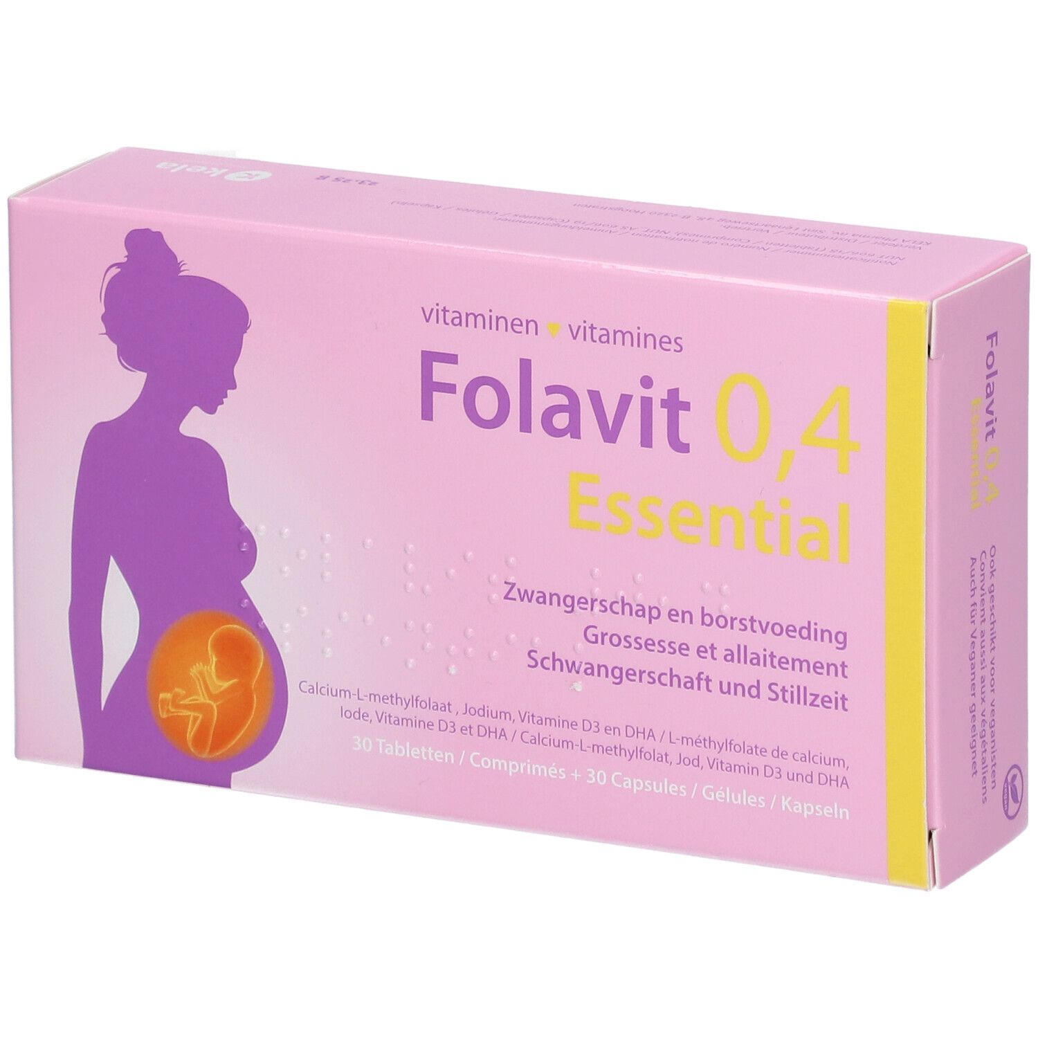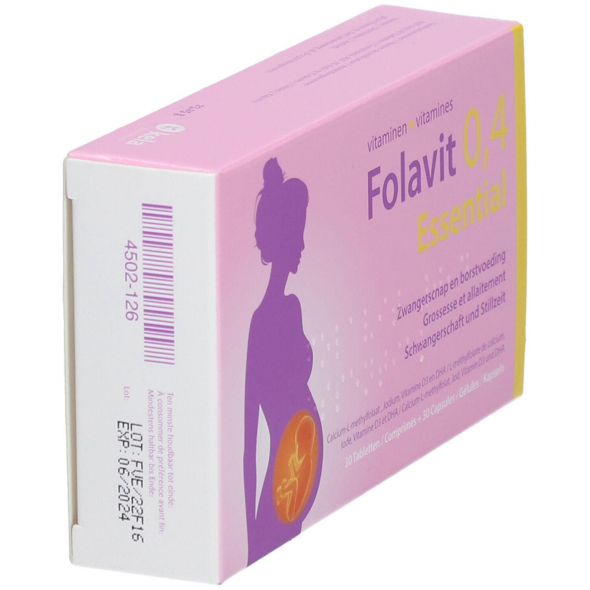 Пищевая добавка Folavit 0.4 Essential специально разработана для беременных и кормящих женщин. Содержит активную форму фолата (400 мкг фолиевой кислоты), йод, витамин D3 и DHA из водорослей. Подходит для вегетарианцев и веганов. Рекомендуется принимать за месяц до зачатия и в первые три месяца беременности для профилактики дефектов нервной трубки.