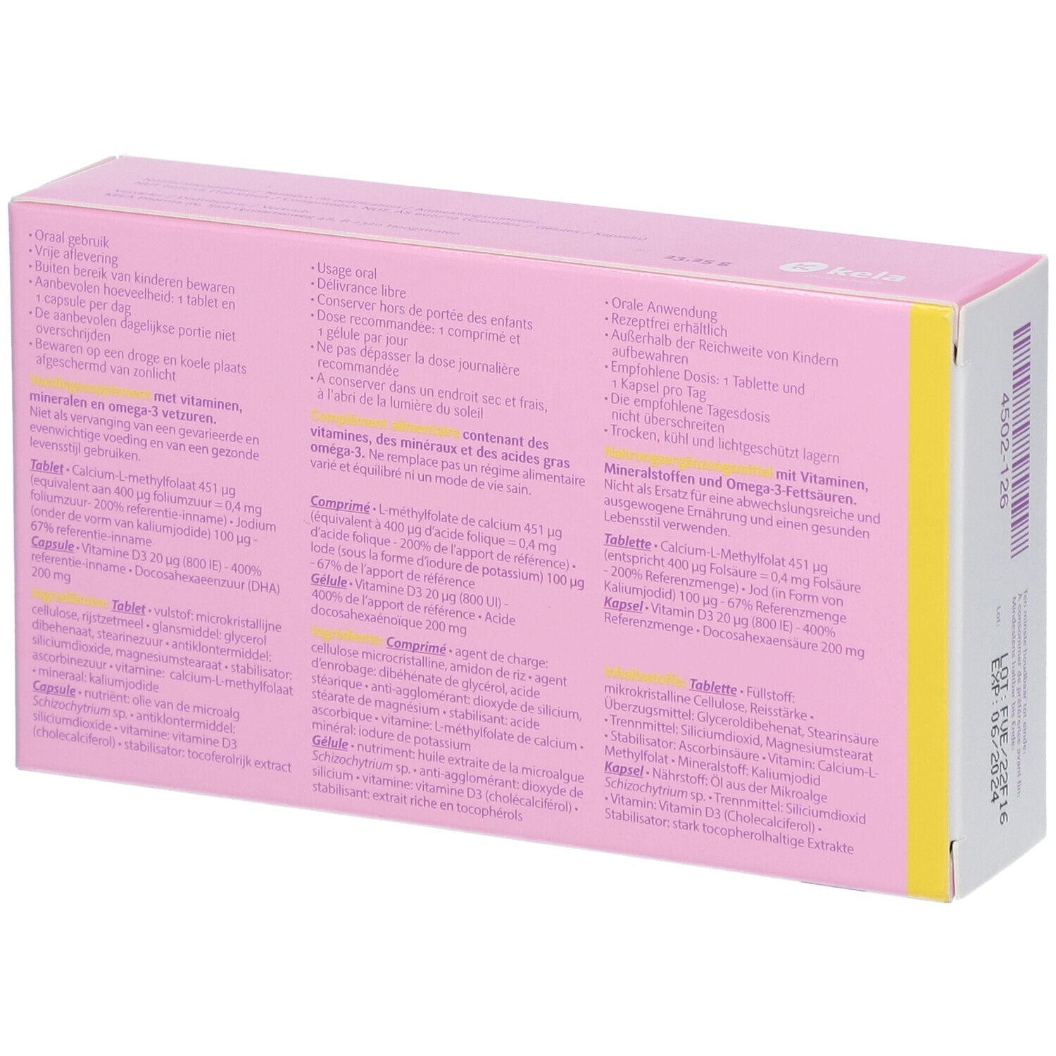 Состав: Таблетка: кальций-L-метилфолат (451 мкг, соответствует 400 мкг фолиевой кислоты), йод (100 мкг), наполнители: микрокристаллическая целлюлоза, рисовый крахмал; покрытие: глицерилдибегенат, стеариновая кислота; антислеживатели: диоксид кремния, стеарат магния; стабилизатор: аскорбиновая кислота. Капсула: витамин D3 (20 мкг), докозагексаеновая кислота (DHA) 200 мг из масла микроводорослей Schizochytrium sp., антислеживатель: диоксид кремния, стабилизатор: экстракт, богатый токоферолом