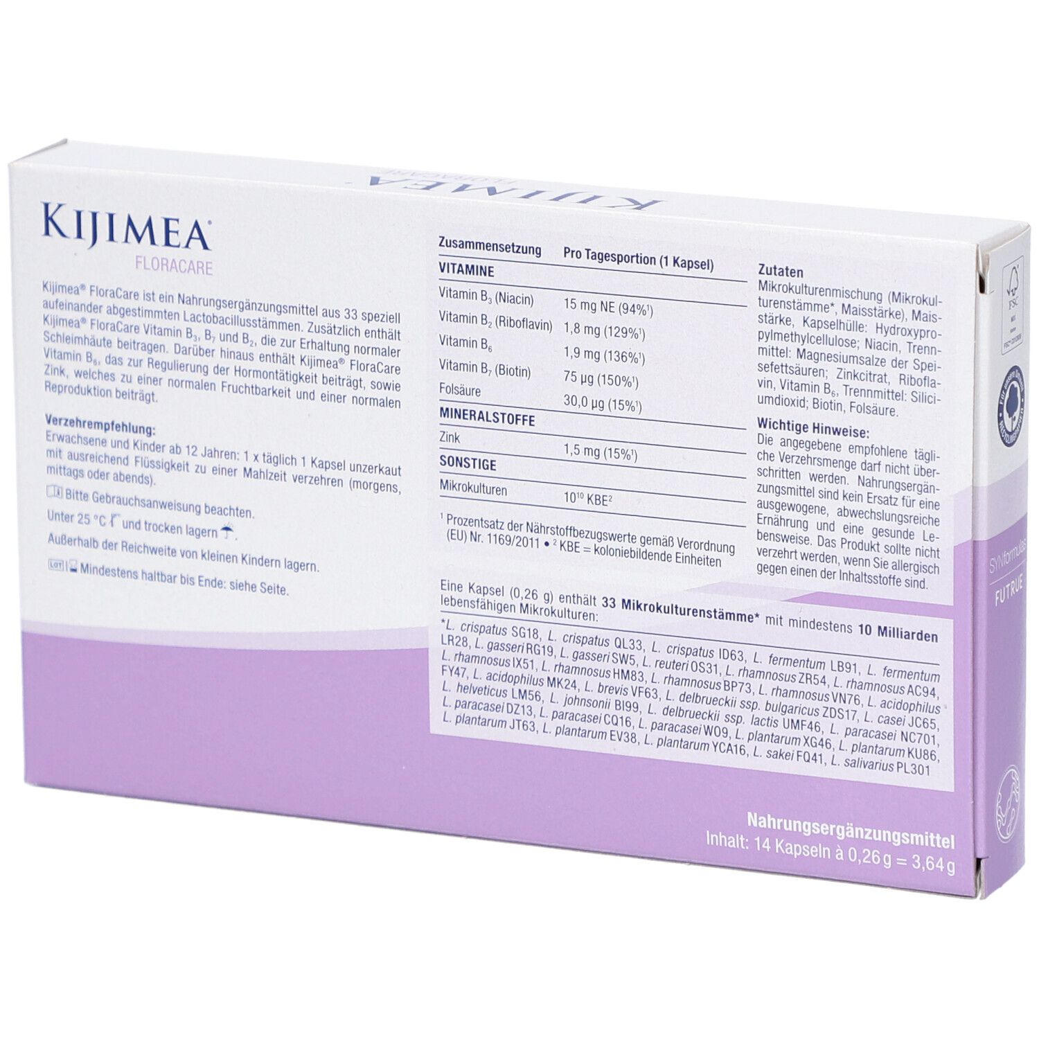Kijimea FloraCare - пищевая добавка с 33 специально отобранными штаммами лактобактерий, витаминами B2, B3, B7, фолиевой кислотой и цинком для поддержания женского здоровья, нормального состояния слизистых оболочек и репродуктивной функции