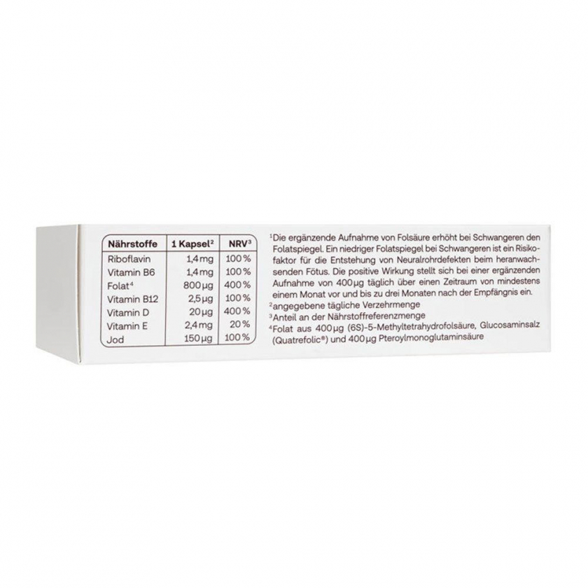 Пищевая добавка для женщин, планирующих беременность. Содержит комплекс витаминов, йод и активную форму фолата Quatrefolic® для оптимальной подготовки организма к беременности. Способствует нормальному росту тканей, кроветворению и снижает риск дефектов нервной трубки у плода.