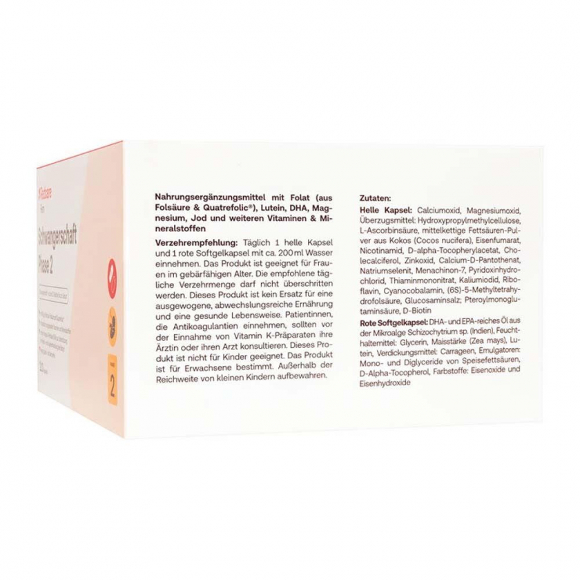 Витаминно-минеральный комплекс для беременных женщин с 13-й недели беременности. Содержит фолат в активной форме Quatrefolic®, витамины группы B, C, D, E, K, минералы (кальций, железо, селен, йод, магний) и омега-3 жирные кислоты из водорослей. Способствует нормальному развитию мозга и глаз плода, поддержанию иммунитета и костной системы.