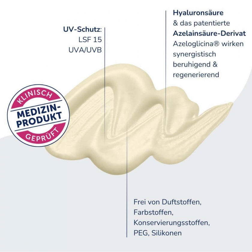 Медицинский крем для лечения розацеи и купероза с SPF 15. Успокаивает покраснения, зуд и жжение, укрепляет кожный барьер, содержит гиалуроновую кислоту и запатентованный азелаиновый комплекс. Без отдушек, красителей, консервантов, парабенов, ПЭГ и силиконов. Подходит для чувствительной кожи.