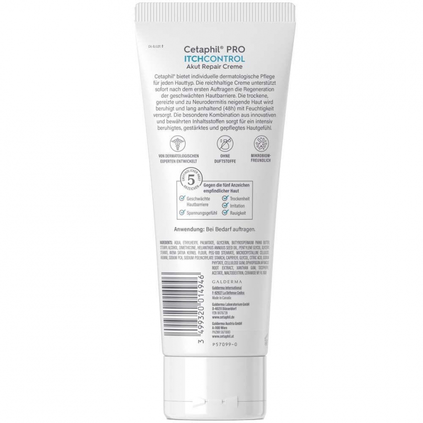 CETAPHIL PRO ItchControl Akut Repair Creme - крем для ухода за кожей при нейродермите, который уменьшает острые симптомы: зуд, сухость и чувство стянутости. Содержит микробиом-дружественную формулу с Ad-Resyl®, филаггриновыми блоками и церамидами, обеспечивает 48-часовое увлажнение и поддерживает регенерацию кожного барьера. Без отдушек и консервантов, подходит для всех типов кожи, включая детскую.