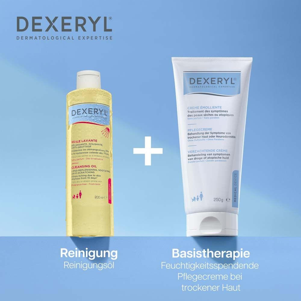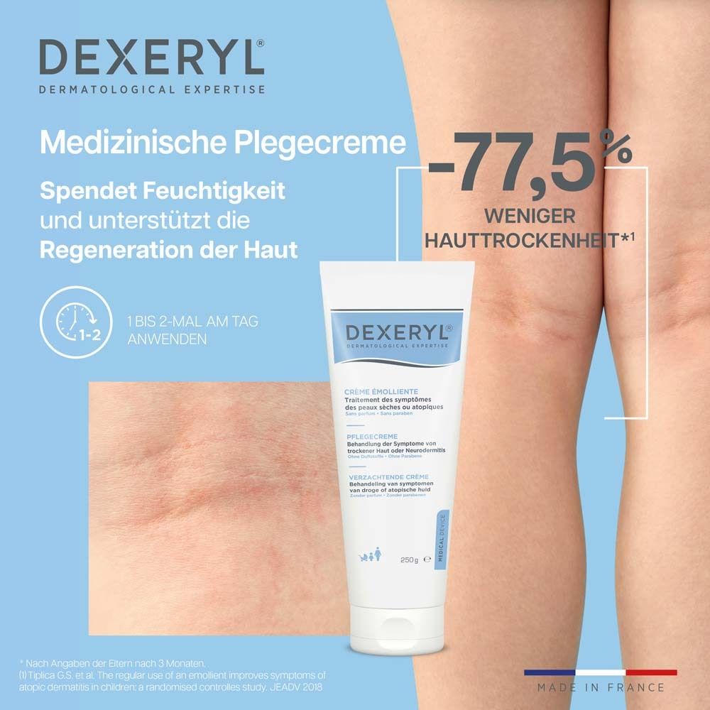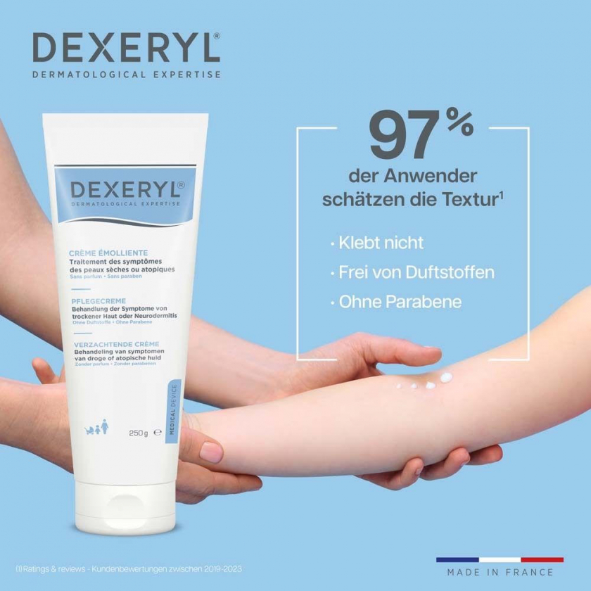 Медицинская увлажняющая крем-эмолент DEXERYL для интенсивного ухода за сухой кожей при нейродермите, ихтиозе и диабетической сухости. Без отдушек, парабенов и раздражителей, подходит для всей семьи с рождения. Восстанавливает кожный барьер, увлажняет до 12 часов, снимает зуд.