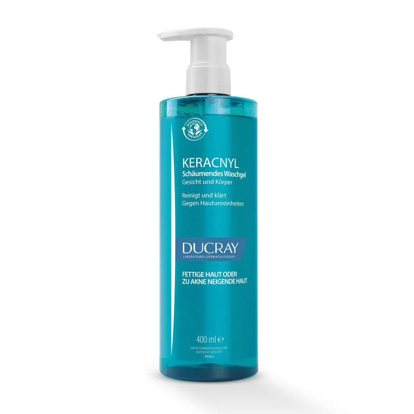 DUCRAY KERACNYL Waschgel - мягкое очищающее средство для проблемной кожи, склонной к акне и прыщам. Содержит инновационный активный компонент Myrtacin®, который разрушает и предотвращает образование бактериального биопленка. Подходит для лица и тела, не содержит мыла, увлажняет кожу и восстанавливает кожный барьер. Может использоваться как самостоятельно, так и в комбинации с другими средствами от акне.