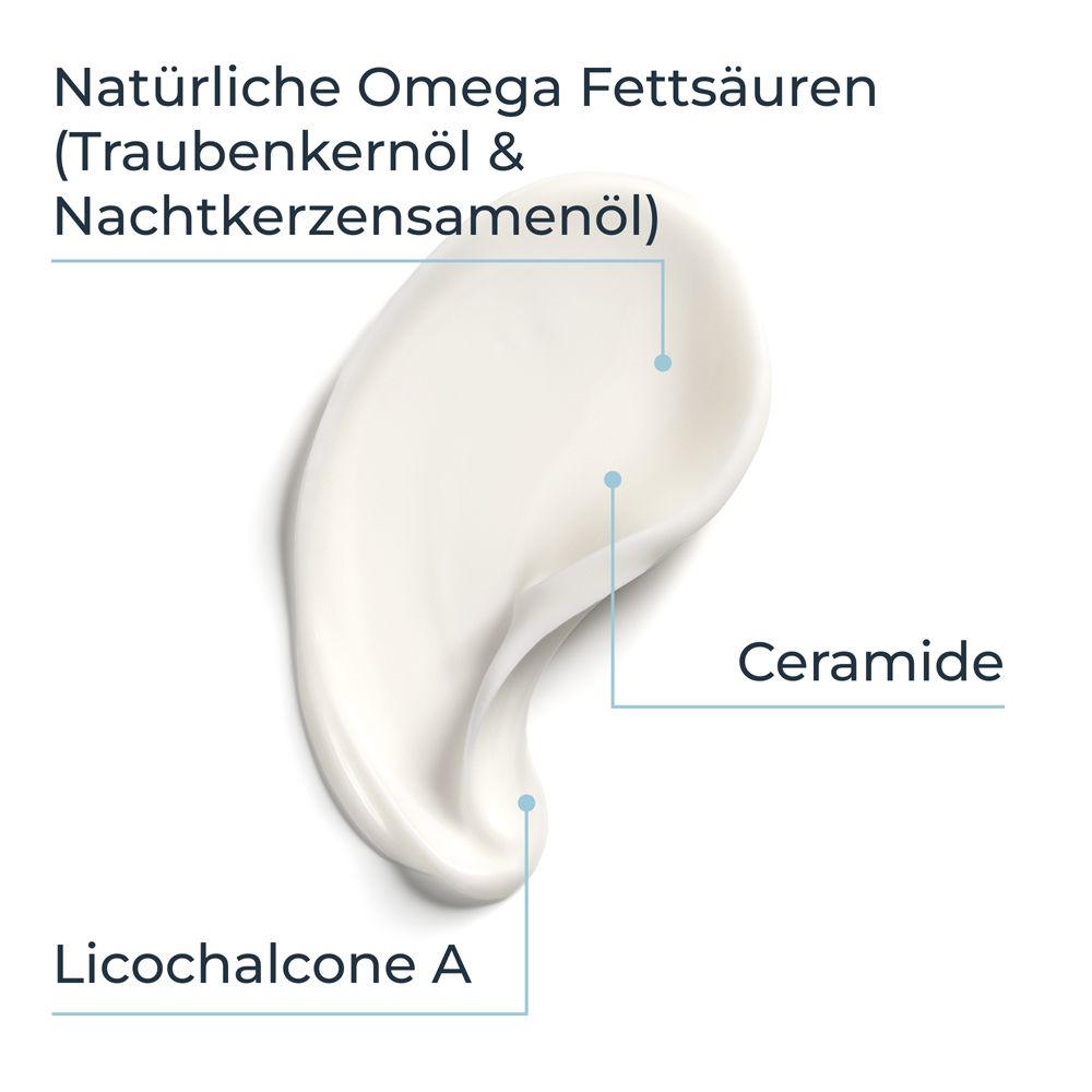Eucerin AtopiControl Beruhigender Leichter Balsam - успокаивающий легкий бальзам для базового ухода при нейродермите и очень сухой коже. Содержит ликохалкон А (экстракт корня солодки), натуральные липиды, масло вечерней примулы, масло виноградных косточек, масло ши и керамиды. Быстро впитывается, увлажняет, успокаивает зуд и укрепляет кожный барьер. Без отдушек и микропластика.
