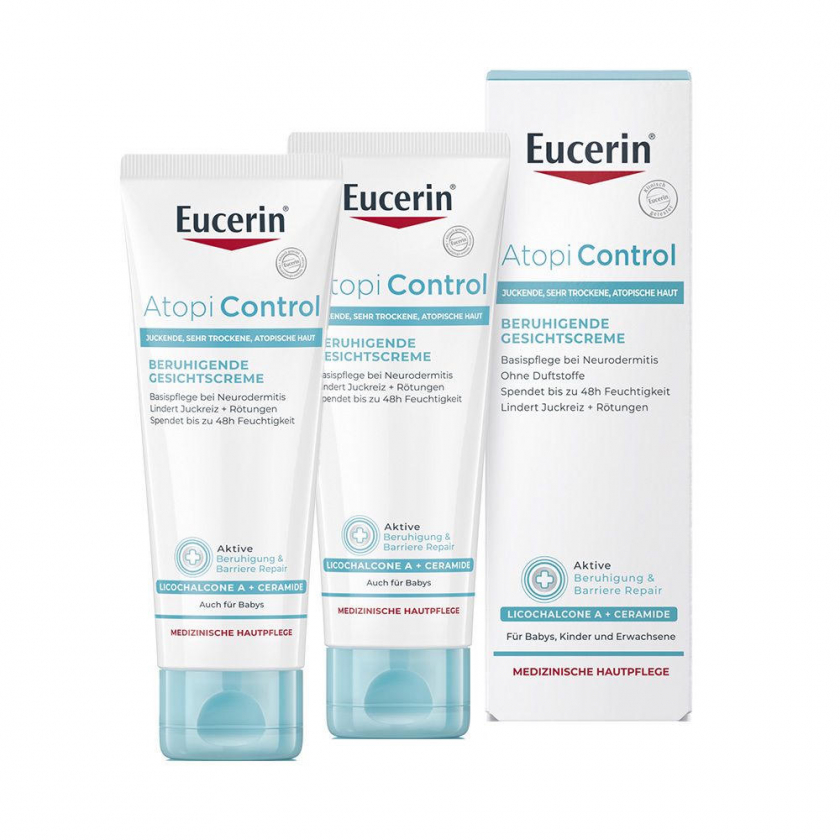 Eucerin AtopiControl Gesichtscreme - успокаивающая крем для лица для ухода за сухой, раздраженной кожей и в безсимптомные периоды при нейродермите. Подходит для взрослых, детей и младенцев с 4 недель. Содержит церамиды, омега-6 жирные кислоты и ликохалкон А, не содержит парабенов, отдушек и красителей.