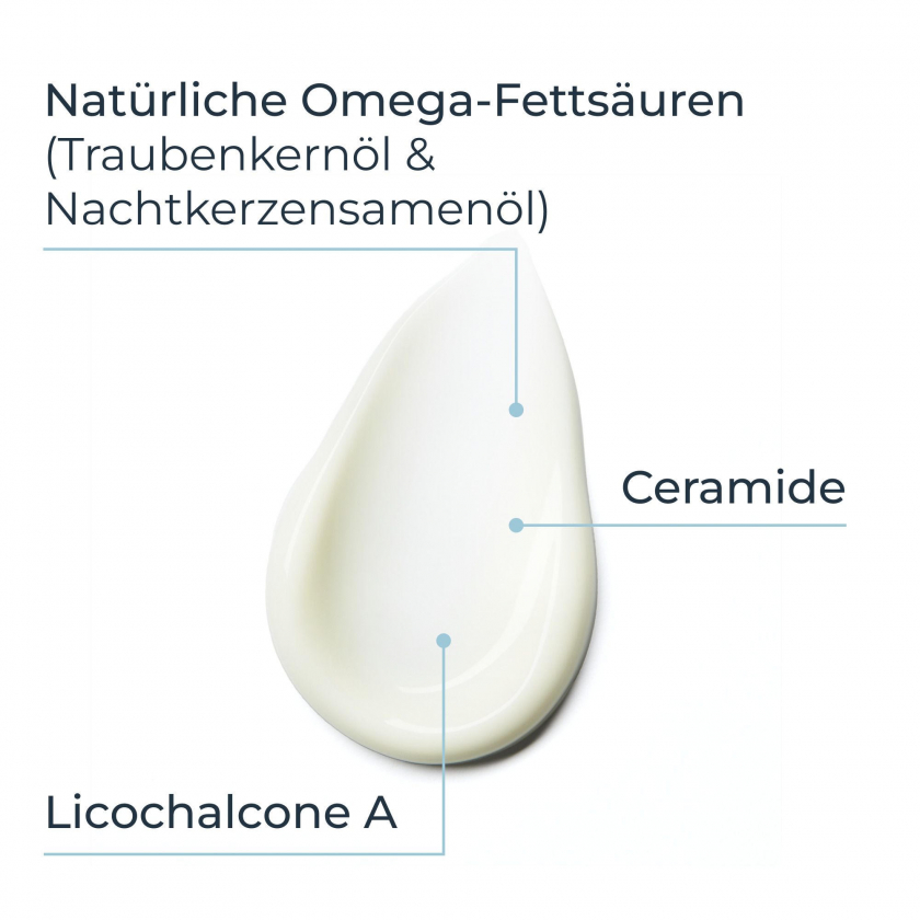 Состав: Вода, глицерин, масло семян подсолнечника, масло ши, каприловый/каприновый триглицерид, масло семян винограда, цетеариловый спирт, глицерилстеарат цитрат, гидроксипропилкрахмал фосфат, гидрогенизированные коко-глицериды, масло энотеры, экстракт корня солодки, церамид NP, фитосфингозин, олеиновая кислота, глицин, натрия PCA, токоферол, аскорбил пальмитат, ксантановая камедь, гидроксид натрия, цитрат натрия, лимонная кислота, 1,2-гександиол, дециленгликоль, феноксиэтанол, этилгексилглицерин, гидроксиацетофенон