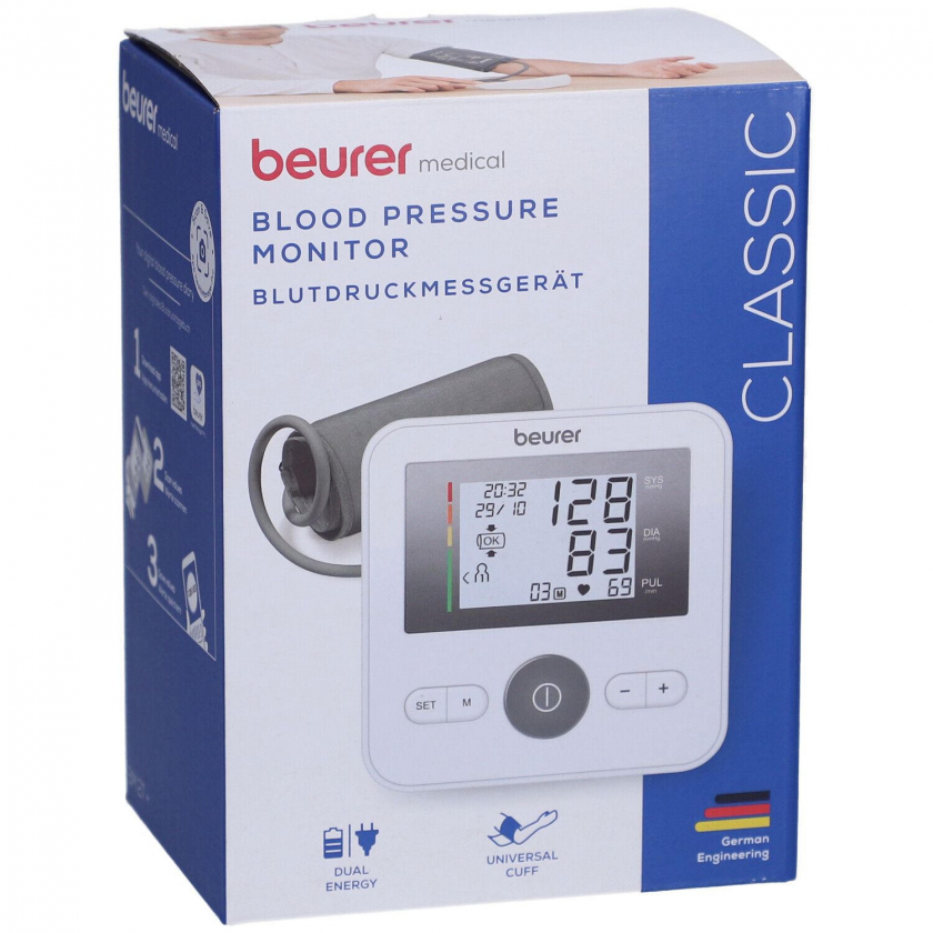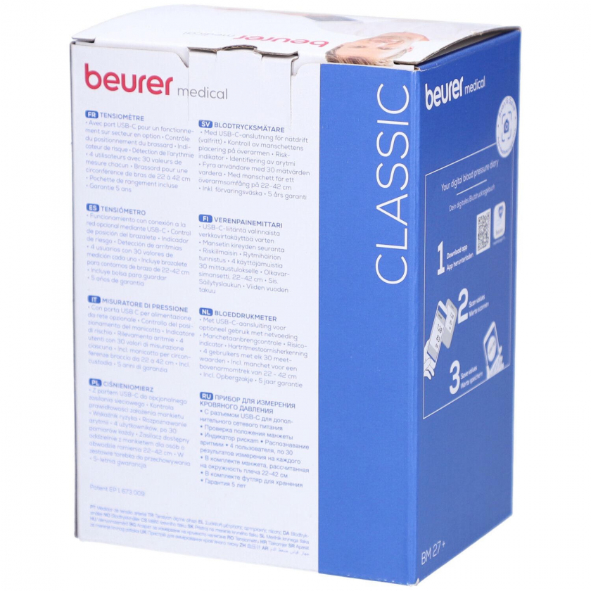 Цифровой тонометр Beurer BM 27 для измерения артериального давления на плече с клинической валидацией. Имеет 4 пользовательских профиля с памятью на 30 измерений каждый, функцию распознавания аритмии, контроль правильности наложения манжеты и цветную шкалу оценки давления. Подходит для окружности плеча 22-42 см.