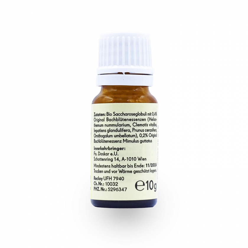 Состав: Био сахарозные глобули с 0,4% оригинальных эссенций цветов Баха (Helianthemum nummularium, Clematis vitalba, Impatiens glandulifera, Prunus cerasifera, Ornithogalum umbellatum), 0,2% оригинальной эссенции цветов Баха Mimulus guttotus