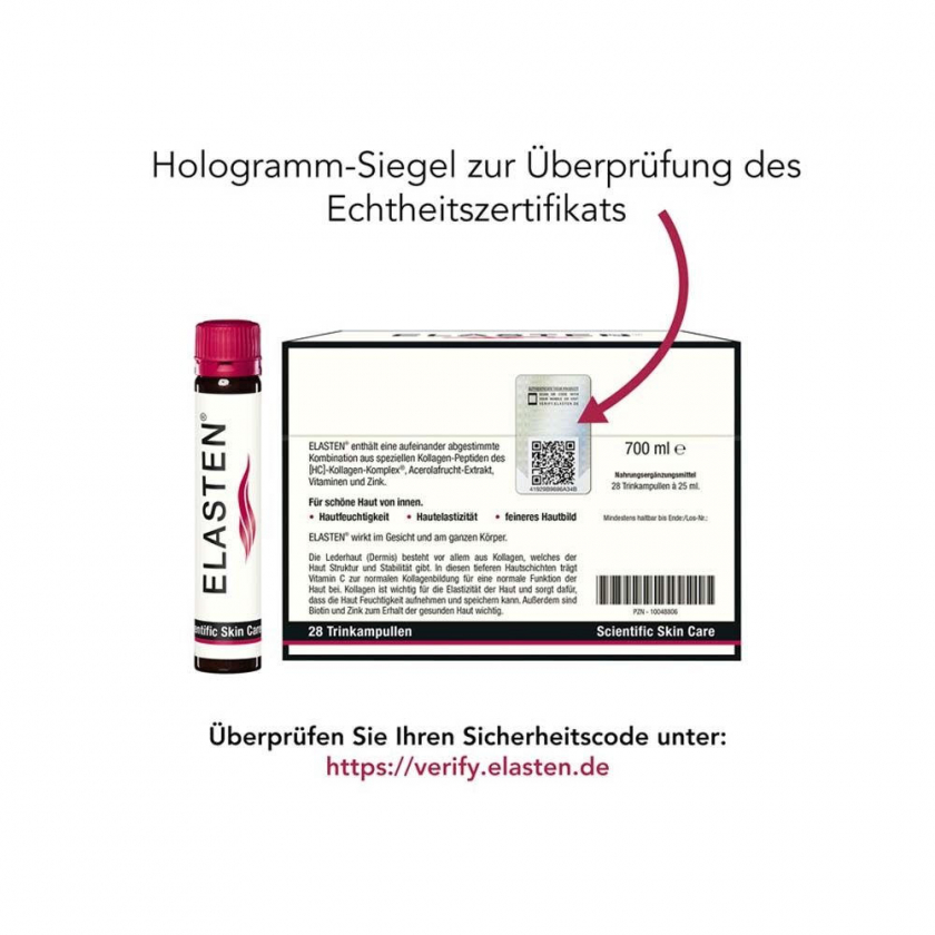 ELASTEN® - пищевая добавка в виде питьевых ампул с коллагеном для улучшения состояния кожи. Содержит коллаген-пептиды, витамин С, цинк, биотин и витамин Е. Улучшает эластичность, упругость и увлажнение кожи, уменьшает глубину морщин. Подходит для мужчин и женщин, рекомендуется курсовой прием в течение 3 месяцев.