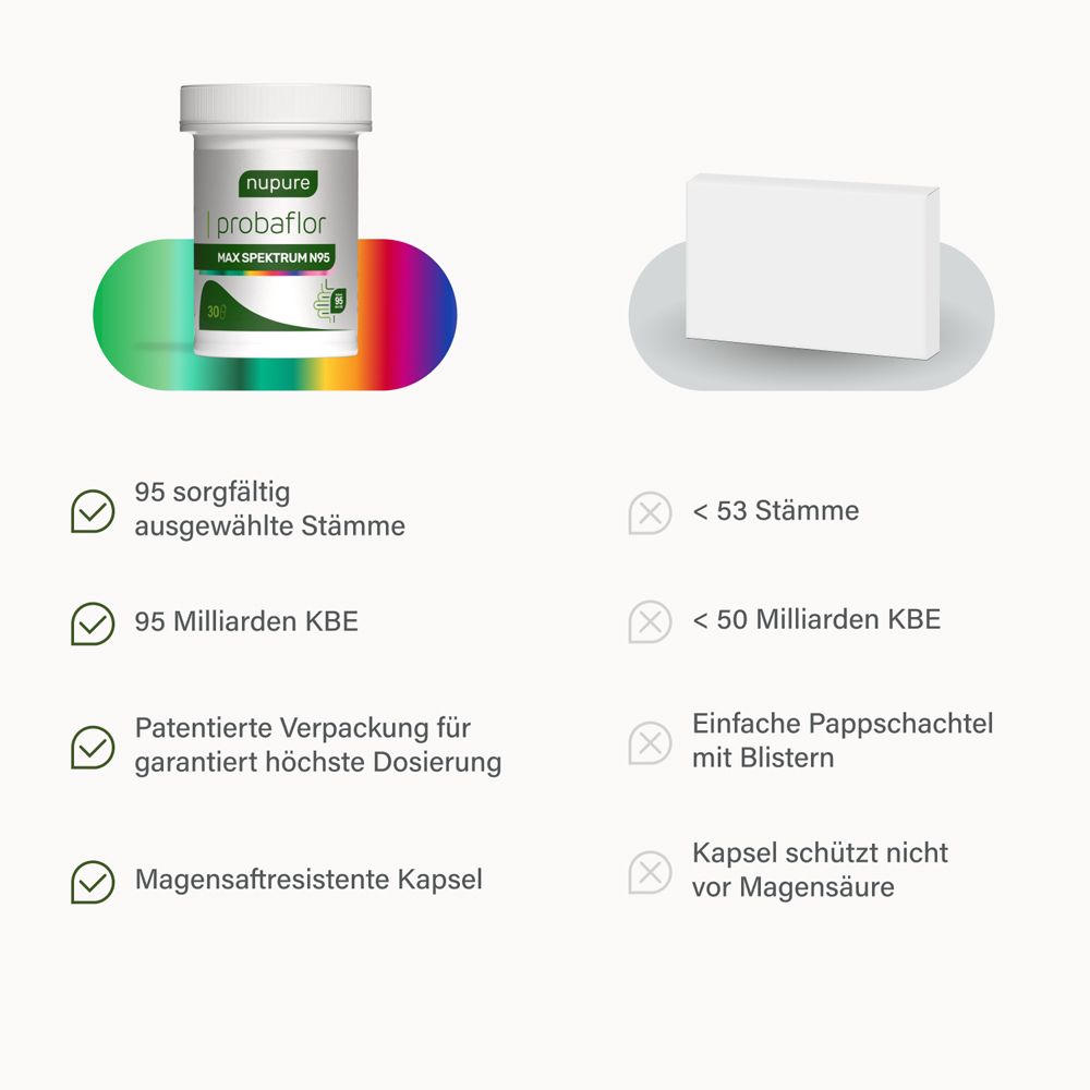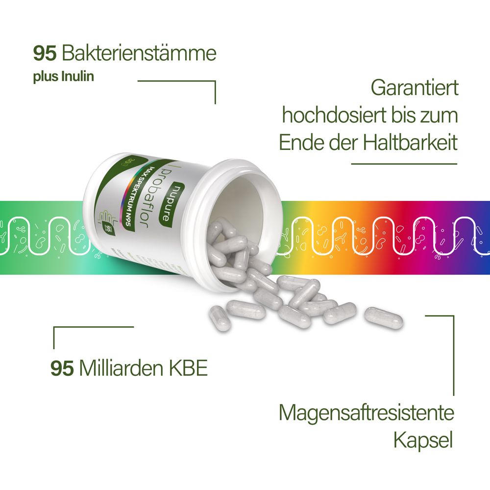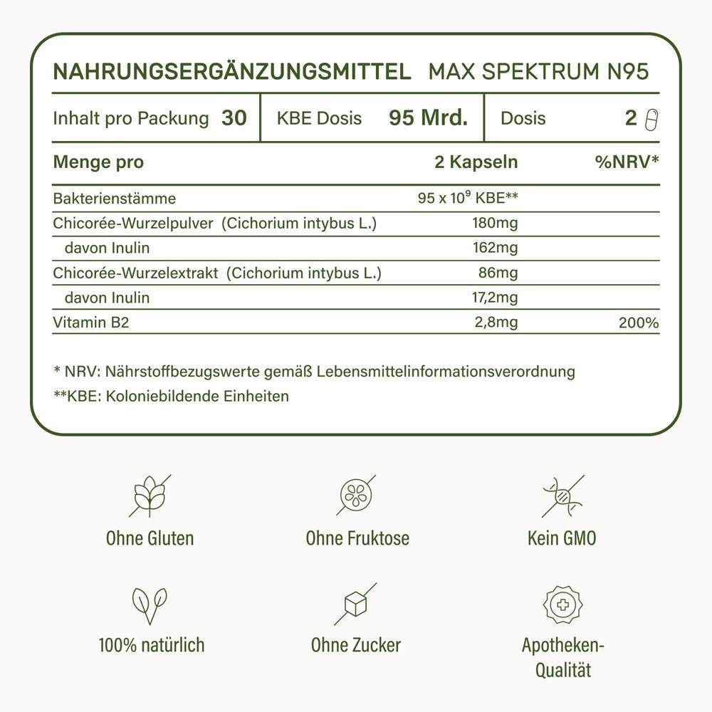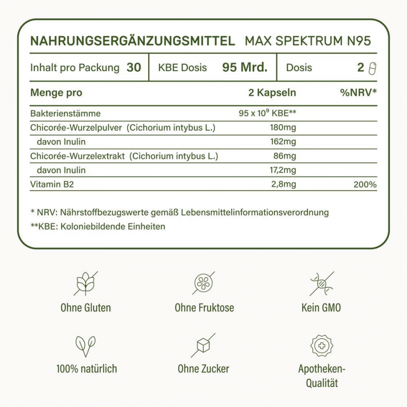 Высокодозированный пробиотик с самым широким в мире спектром из 95 научно исследованных штаммов молочнокислых бактерий. Обеспечивает 95 миллиардов КОЕ на суточную дозу, поддерживает пищеварение и здоровье кишечной слизистой благодаря цикорию и витамину B2. Капсулы с кишечнорастворимой оболочкой обеспечивают максимальную выживаемость и эффективность бактерий.