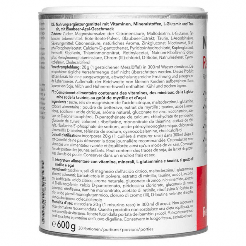 Состав: Сахар, соли лимонной кислоты магния, мальтодекстрин, L-глутамин, пищевой краситель: порошок свеклы, экстракт черники; таурин, L-аскорбиновая кислота, подкислитель: лимонная кислота, натуральный ароматизатор, глюконат цинка, никотинамид, D-альфа-токоферилацетат, кальция D-пантотенат, гидрохлорид пиридоксина, глюконат меди, краситель: рибофлавин, тиаминмононитрат, ретинилацетат, натрия рибофлавин-5'-фосфат, птероилмоноглутаминовая кислота, хлорид хрома(III), D-биотин, селенат натрия, цианокобаламин, холекальциферол
