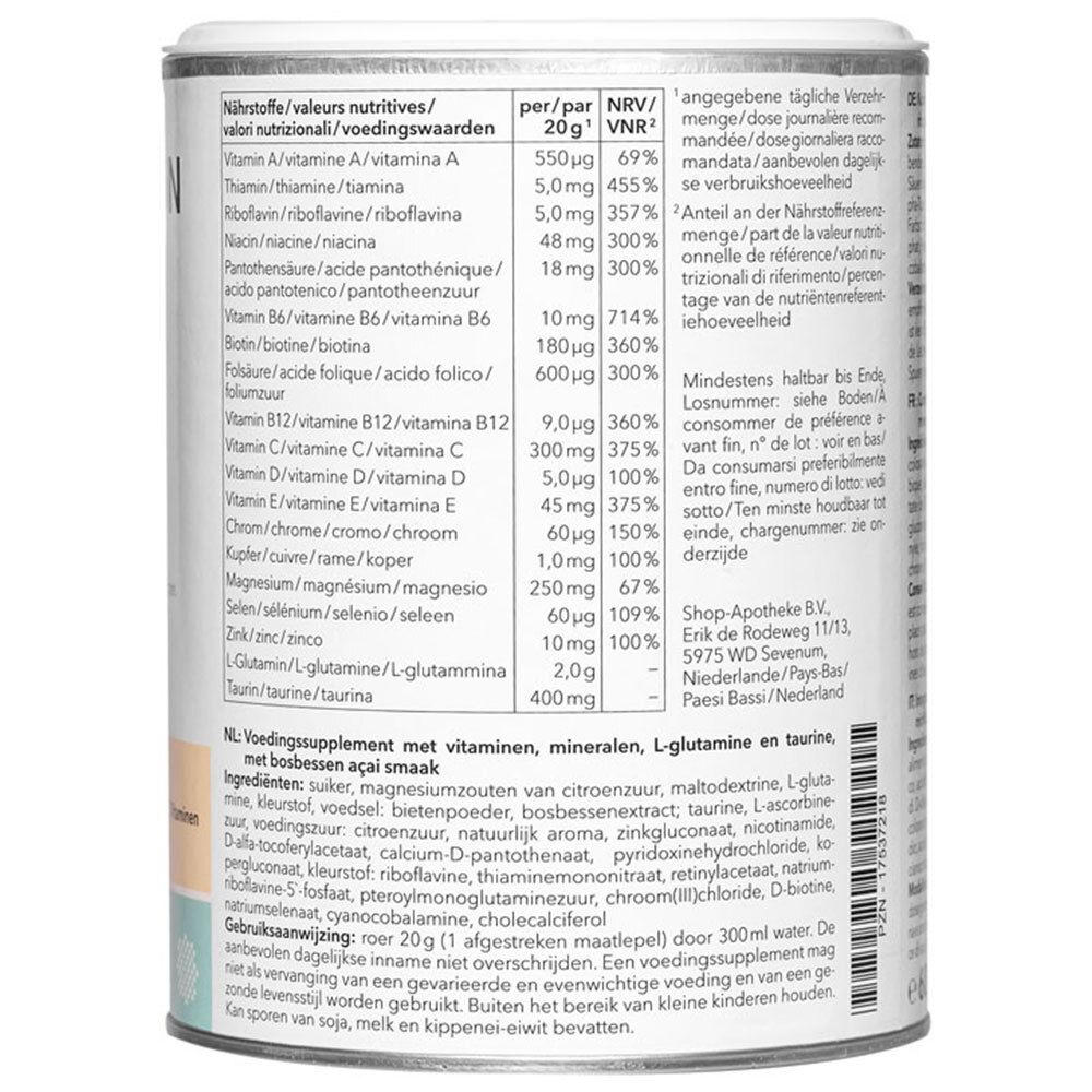 Пищевая добавка в виде порошка с L-глутамином, таурином, 12 витаминами и 5 минералами для поддержания здоровья кожи и слизистых оболочек кишечника. Способствует укреплению иммунитета, защите клеток от окислительного стресса и нормальному функционированию кожи. Имеет вкус черники и асаи, легко растворяется в воде.