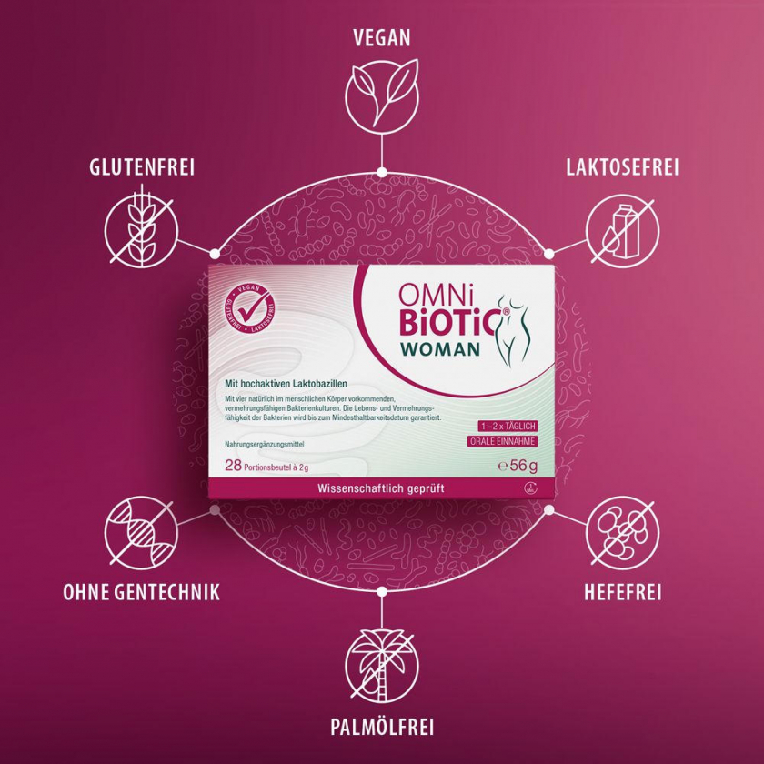 Пробиотическая добавка OMNi-BiOTiC® WOMAN специально разработана для поддержания женского здоровья. Содержит 4 специально подобранных штамма бактерий для восстановления микрофлоры влагалища. Продукт не содержит глютена, лактозы, гормонов и животного белка, подходит для диабетиков, беременных и кормящих женщин.