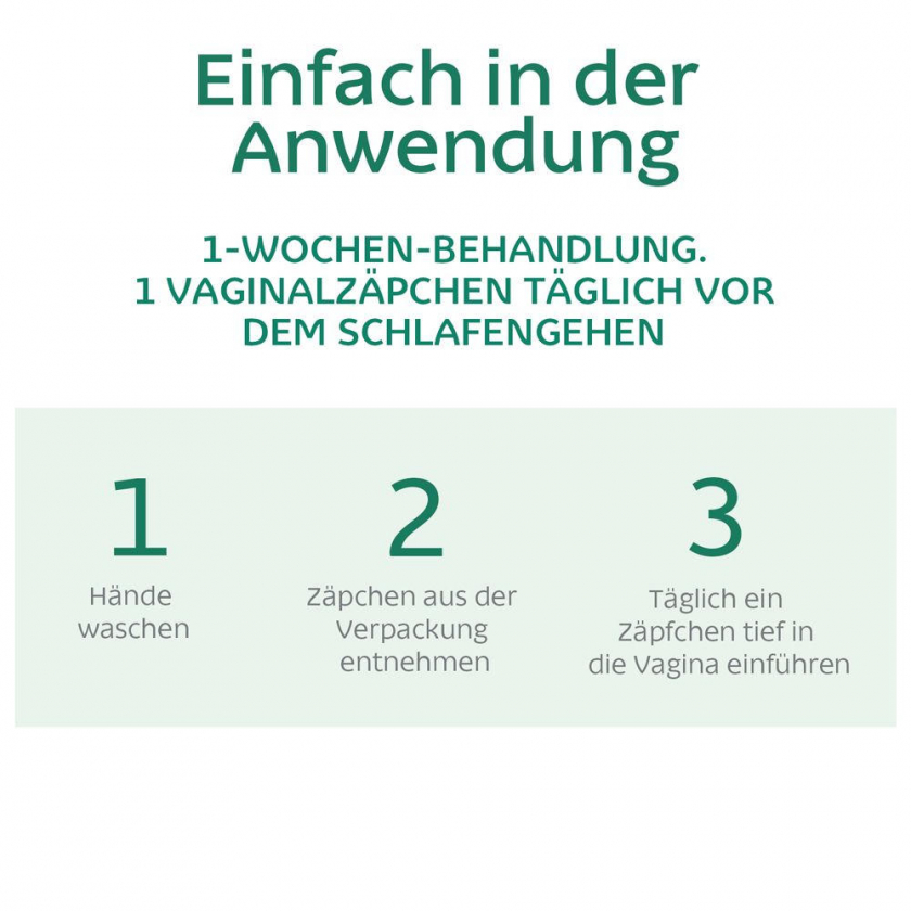 Способ применения: Введение 1 вагинального суппозитория глубоко во влагалище ежедневно в течение 7 дней, предпочтительно перед сном