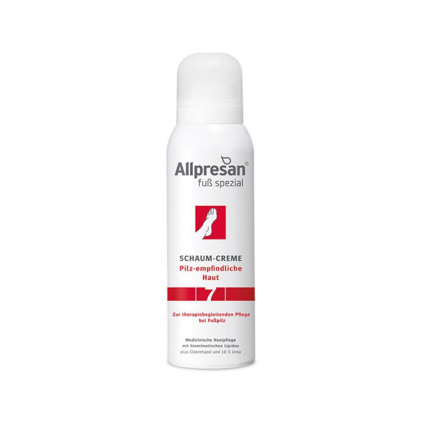 Allpresan Fuß spezial Nr. 7 Schaum-Creme - пенная крем-пена с 10% мочевиной и клотримазолом для дополнительного ухода при терапии грибковых инфекций стоп и ногтей. Увлажняет кожу, восстанавливает кожный барьер, обладает противомикробным действием. Подходит для ежедневного применения.