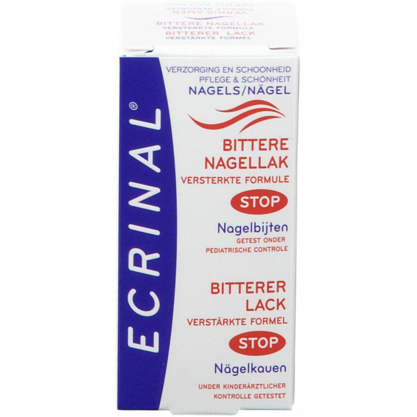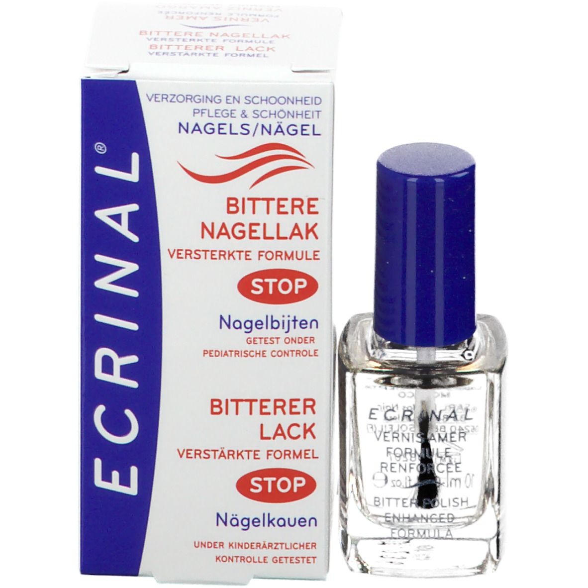 Горький лак ECRINAL® для предотвращения обкусывания ногтей и кутикулы. Прозрачный лак с экстремально горьким вкусом, который отучает от вредной привычки. Также способствует росту ногтей. Подходит для детей от 3 лет для отвыкания от сосания пальца. Содержит Bitrex® - самое горькое вещество в мире.