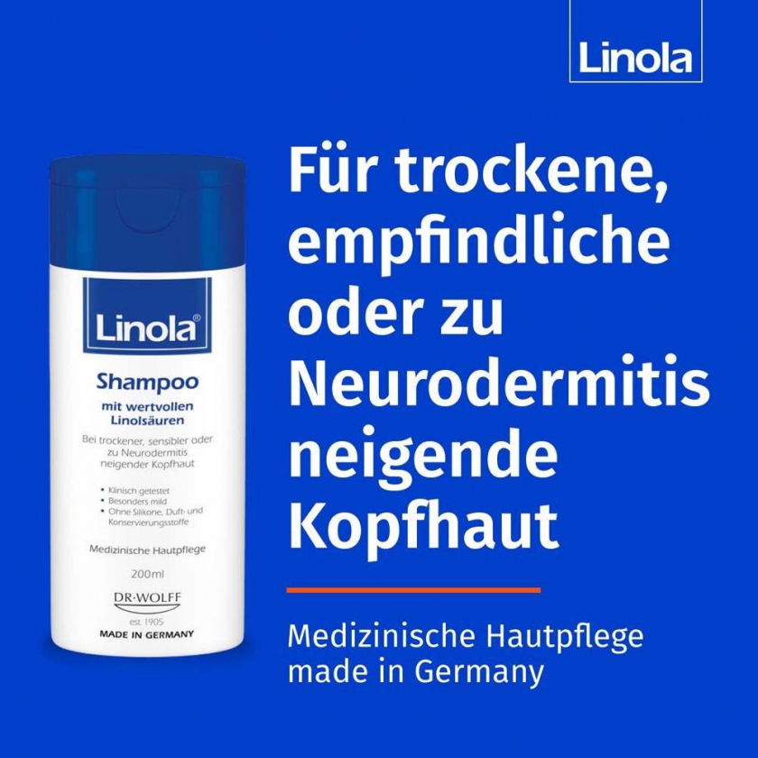 Шампунь Linola для сухой, чувствительной кожи головы и склонной к нейродермиту. Бережно очищает, увлажняет, содержит линолевую кислоту для укрепления защитного барьера кожи. Без силиконов, красителей, отдушек, консервантов и микропластика. Подходит для ежедневного использования.