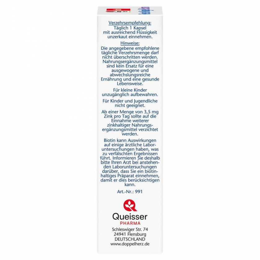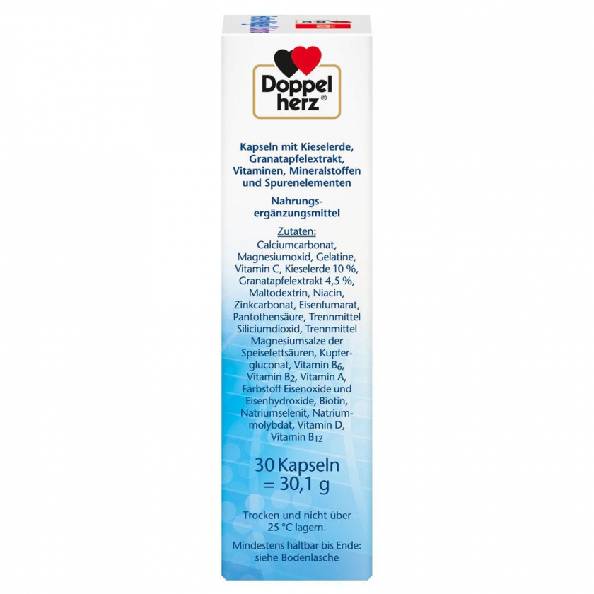 Биологически активная добавка Doppelherz aktiv Feste Nägel EXTRA содержит комплекс из 16 витаминов, минералов и микроэлементов для укрепления ногтей и поддержания здоровья кожи. Включает цинк, селен, биотин, витамины группы B, кремнезем и экстракт граната. Рекомендуется для улучшения состояния ногтей и кожи.