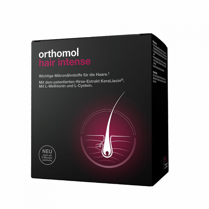 Orthomol Hair Intense - пищевая добавка для поддержания здоровья и красоты волос. Содержит биологически активные вещества: биотин, цинк, селен, медь, витамины группы B, аминокислоты L-цистеин и L-метионин, а также запатентованный комплекс KeraLiacin®. Способствует нормальному состоянию волос, их пигментации и защите от окислительного стресса.