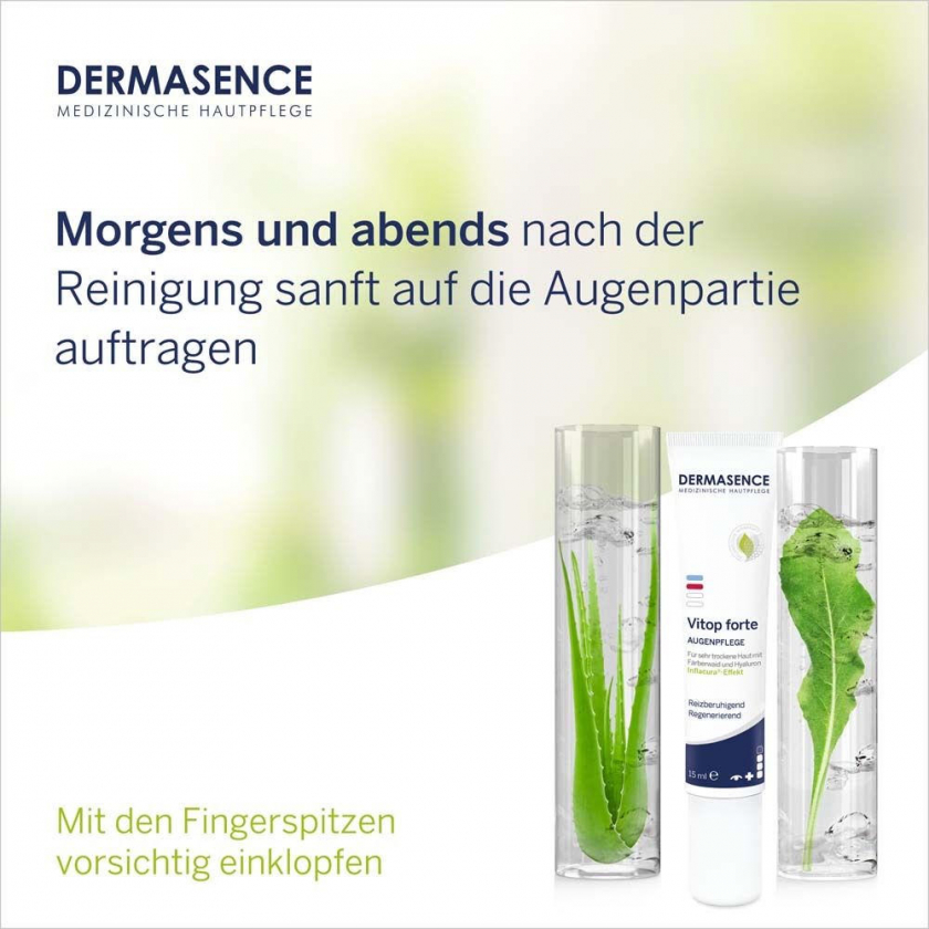 DERMASENCE Vitop forte Augenpflege - профессиональная уходовая косметика для кожи вокруг глаз, специально разработанная для очень сухой, зудящей кожи, склонной к нейродермиту. Содержит уникальный Vitop-комплекс, гиалуроновую кислоту и керамиды для восстановления кожного барьера, увлажнения и уменьшения воспалений.