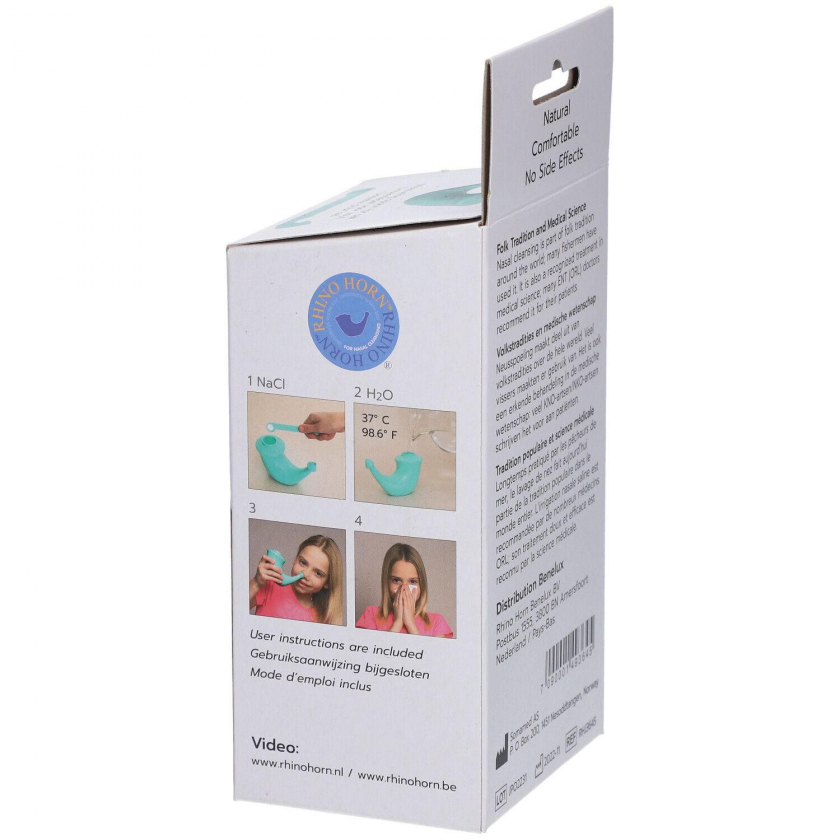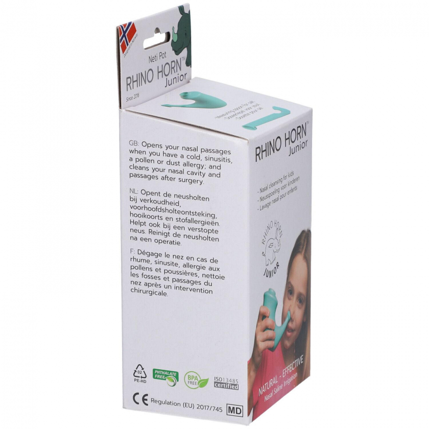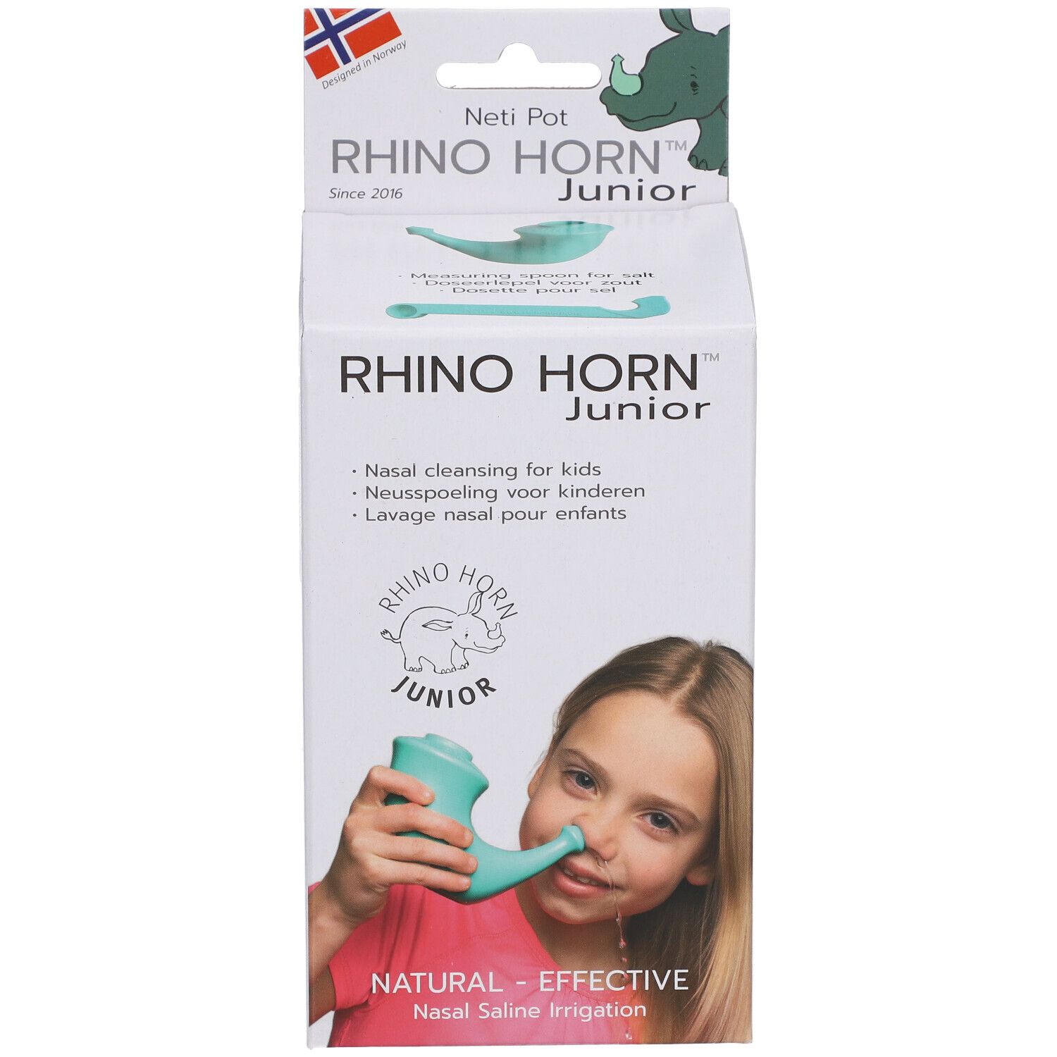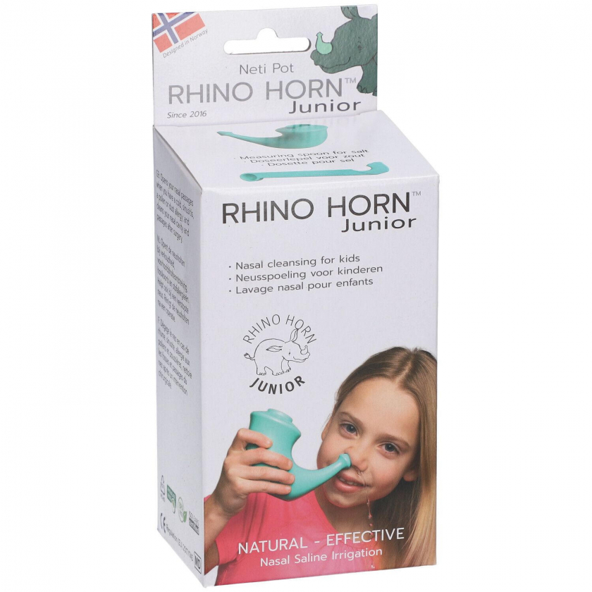 Neti Pot RHINO HORN Junior - специальное устройство для промывания носа у детей 4-12 лет. Помогает при насморке, заложенности носа, аллергиях и синуситах. Безопасное и простое в использовании средство для носовой гигиены без химических добавок.