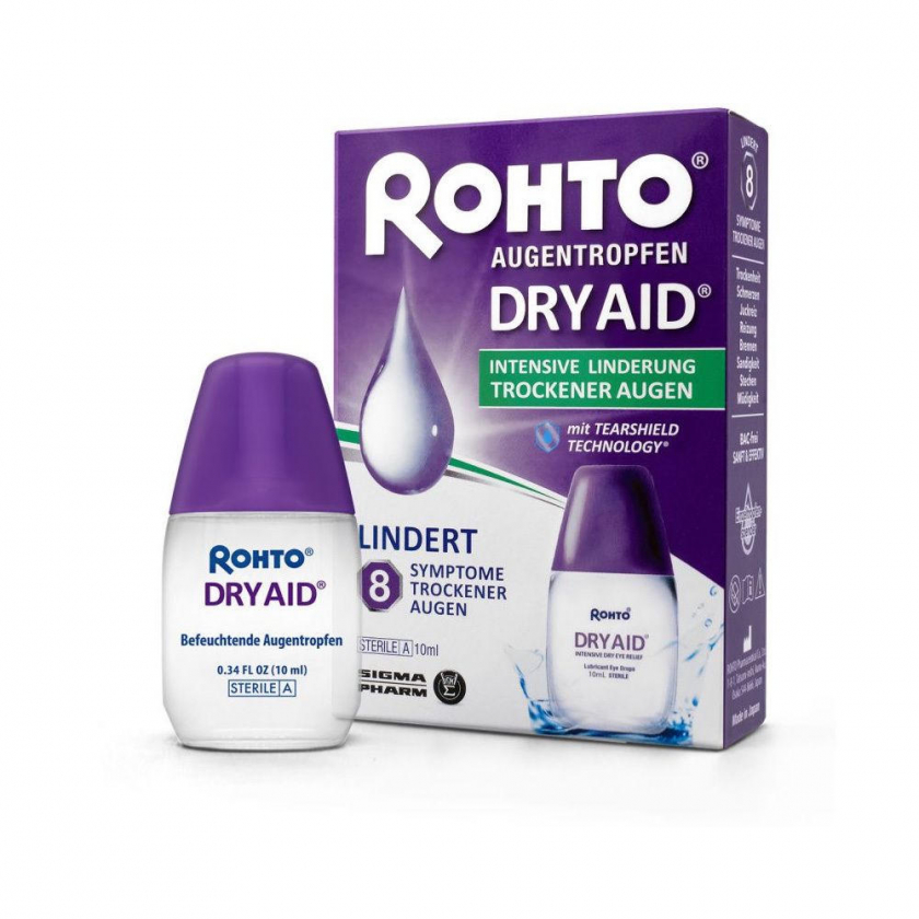 Rohto Dry Aid - это клинически проверенные увлажняющие глазные капли с инновационной технологией Tearshield Technology®, которые обеспечивают тройную защиту слезной пленки. Средство предназначено для лечения синдрома сухого глаза, вызванного различными факторами окружающей среды и образа жизни. Капли восстанавливают естественный слезный слой, обеспечивая длительное облегчение и защиту от симптомов сухости глаз до 12 часов.